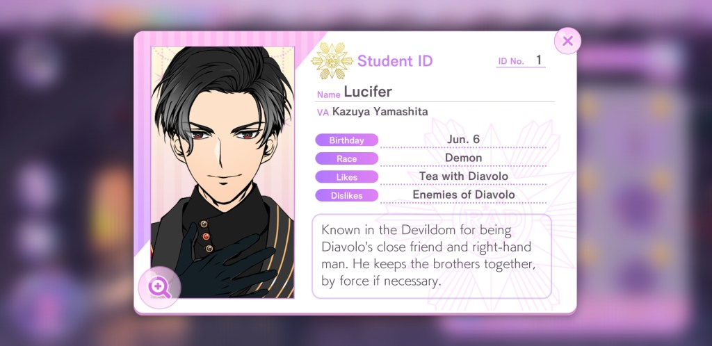 If you do decide to pursue Lucifer, you’ll find your romance with him turbulent and very much a slow-burn. But, the pay-off is worth the wait, and the side-stories with Lucifer are often spicier than the other characters. These side-stories are available through the ‘Devilgram’ feature and are unlocked when you receive cards in the game’s gacha, called ‘Nightmare’. The Devilgram stories allow for more private time with the demon (or angel, or warlock…) of your choice.