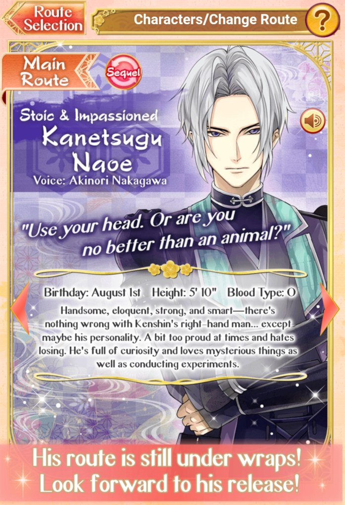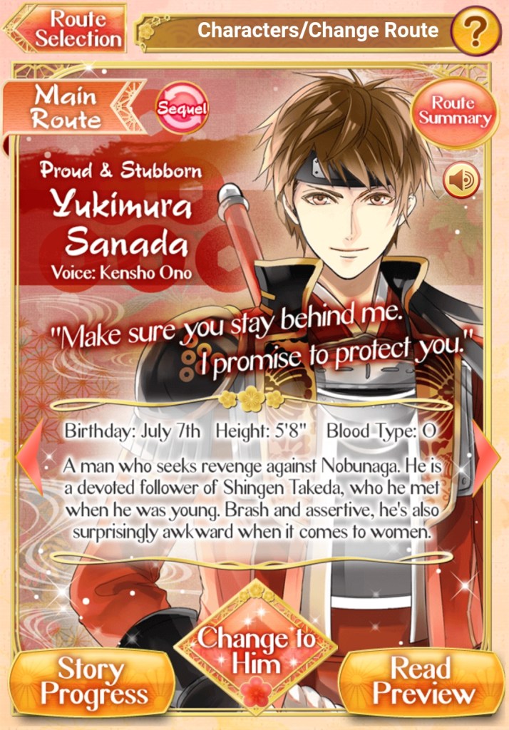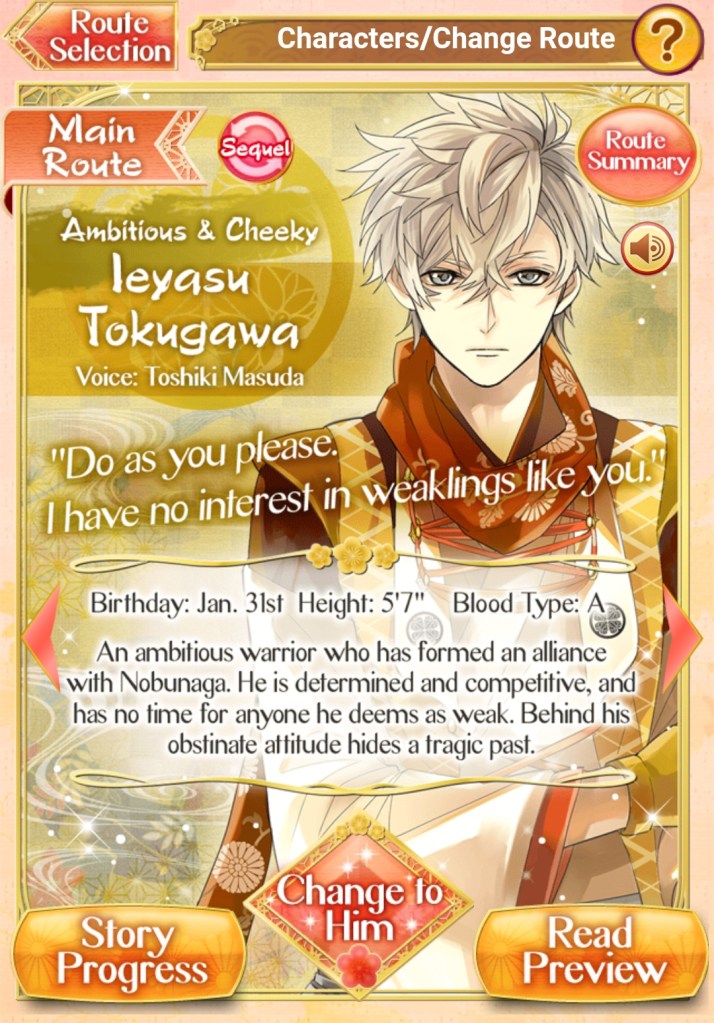 Tokugawa Ieyasu is a grumpy boy who insists on keeping his distance, no matter how much MC tries to get to know him. In his route, Ieyasu is tasked with keeping an eye on MC to prevent her from trying to run away (again), but he seems utterly displeased with these orders. MC refuses to let this get her down and only grows more determined to get to know him. As she persistently pursues this prickly samurai, she sees an ambitious, determined, and kind man beneath his contrary and abrasive exterior.