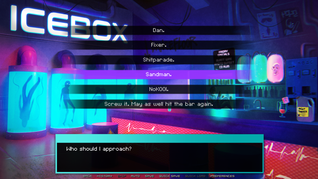 Premise: Fresh out of a break up, MC has embarked on an adventure to Stradania to drown her sorrows in booze and (hopefully) men. You arrive at a nightclub called the ‘Icebox’, apparently a cyborg-friendly ‘hotspot’, where you hope to meet someone to take back to your hotel.