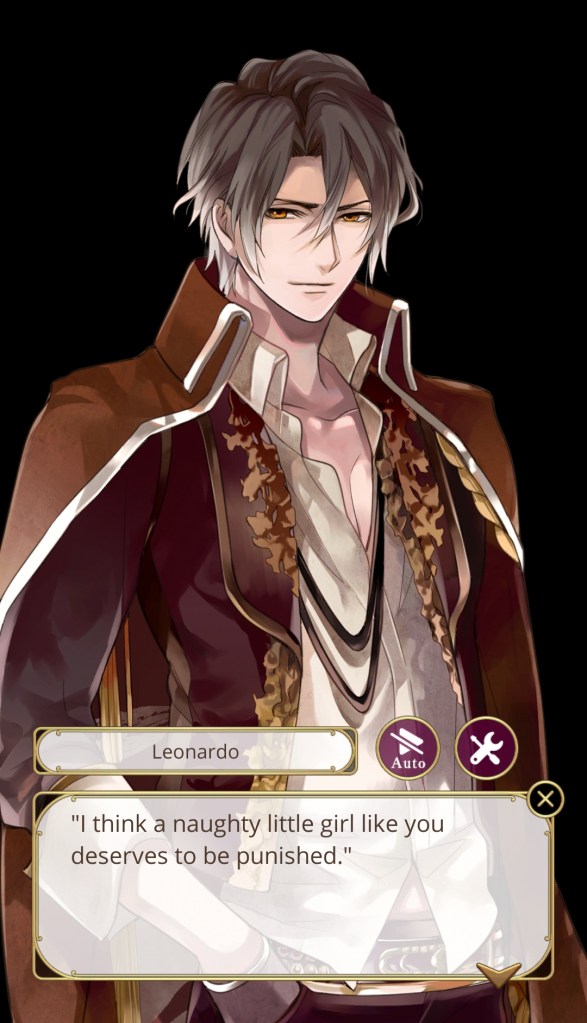 Tropes: ‘Oji-san’ means ‘Uncle’ but it’s also used more generally to refer to older men. Leonardo is one of the eldest vampires in the game, and the large gap in age and life experiences between him and MC becomes a recurring theme in his route. Initially, MC is frustrated with Leonardo’s habit of whisking her away to follow his whims, but she soon sees that he’s actually caring for her in his own, eccentric way.