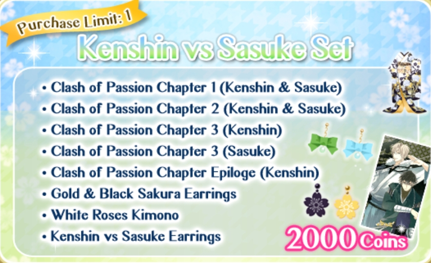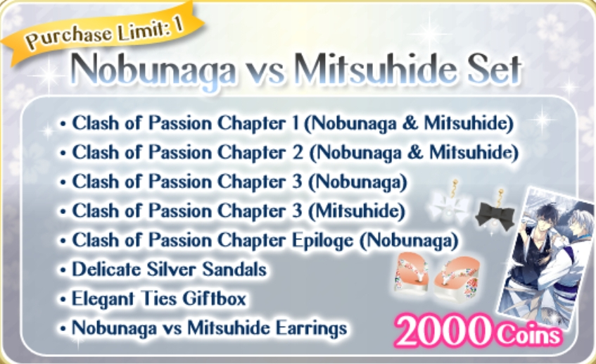 There are multiple sets available; one ‘Special Set’, and four ‘VS’ sets, each focused on one of the four available pairs (note: Masamune vs. Mitsunari is only available in the full version). The full set comes with all of the Clash of Passion stories, 14 attire items, and 4 unique themes for ‘His Room’. It looks like these themes are only available in the ‘Special Set’, as they’re not listed in the contents for the ‘VS’ sets.