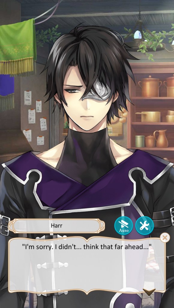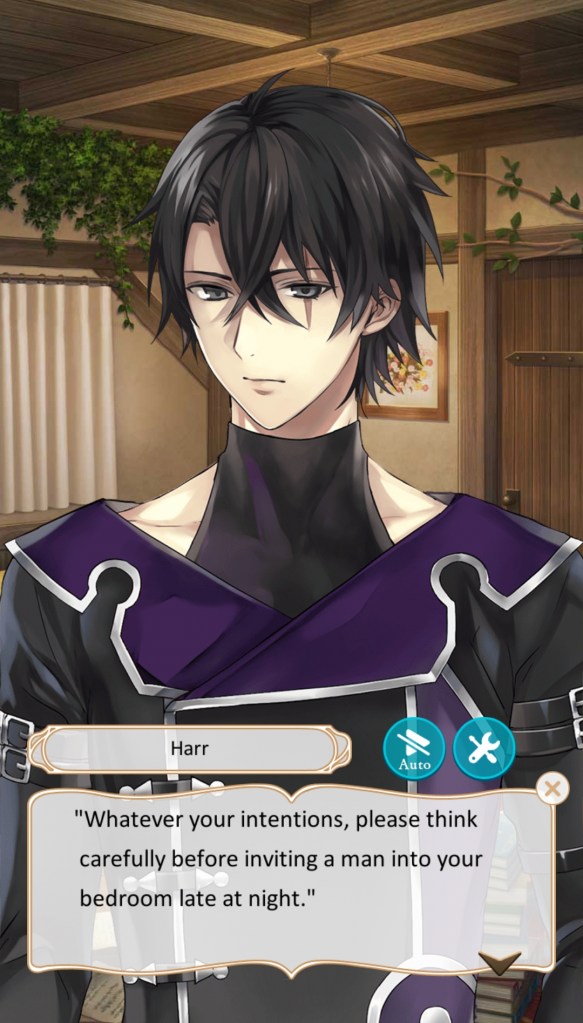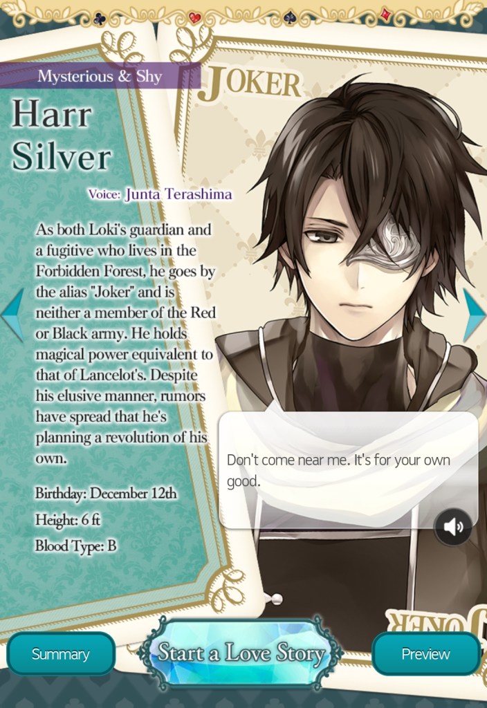 Harr Silver (Joker): A mysterious, wanted criminal renowned for being a powerful wizard. His intentions aren’t clear, and he seems to have connections to both armies, but you can’t shake the feeling that he’s far too kind to be a bad guy. Harr’s route sheds a lot of light on the overarching plot of Ikémen Revolution, but he’s also an overall sweet, shy love interest who vows to keep you safe.