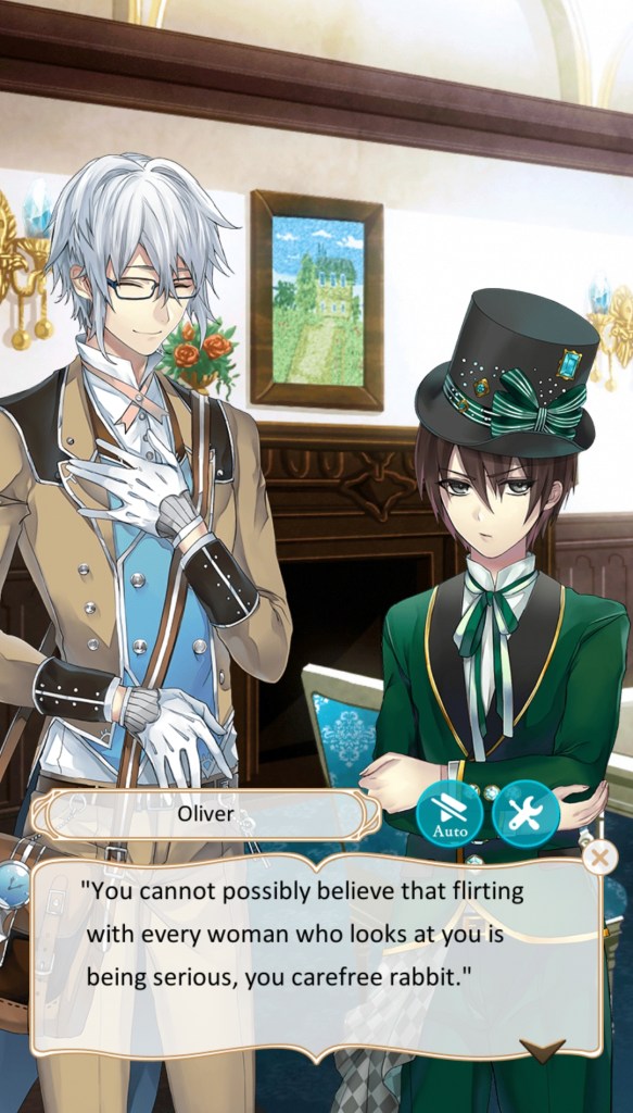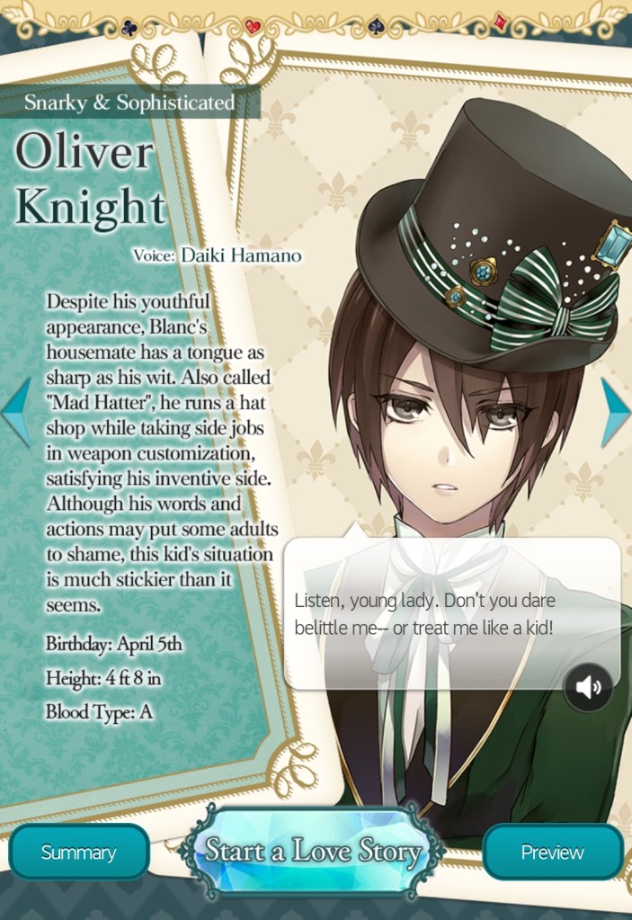 Oliver Knight (Mad Hatter): Oliver is a complicated character. He’s a very Grumpy Boy, but also a genius inventor who sells his inventions to the Black Army. He lives with Blanc (even though he constantly complains about Blanc’s clumsiness and love of carrots) and he insists that you don’t treat him like a child, despite the way he looks. Oliver is odd and mysterious, but becomes defensive and rude if you try to pry into his secrets. A compilation of contradictions, this route is definitely not what it seems.