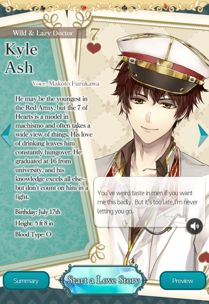 Kyle Ash (7 of Hearts): Kyle is the Red Army’s doctor. He acts carefree and lazy, but he’s actually intensely dedicated to his job and passionate about medicine. As you get to know Kyle, you discover his simple, pure dream that you can’t help but admire, despite his sarcasm and fondness for alcohol.