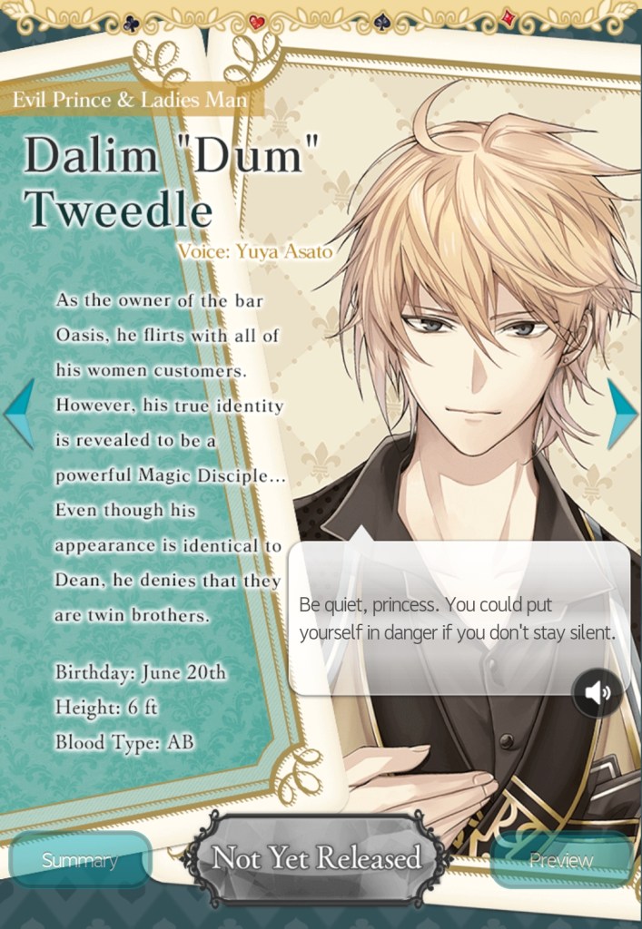 Dalim (Dum) Tweedle: Dum is a flirty playboy that the women love and the men hate. He has a dangerous allure that you know you shouldn’t find intriguing but you still find yourself drawn to him anyway. He warns you to stay away and you get the feeling that he’s hiding something, but you sense a kindness that encourages you to stay and find out the truth. As with Dean, Mousse, and Blanc, Dum’s route is not yet available, but I sincerely hope it will be soon, as I’m very curious to learn more about the ‘Evil Prince’.