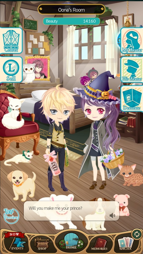 As well as the attire you purchase for challenges throughout the story, you can also collect avatar attire through events, completing intimacy challenges, and other bonuses throughout the game. These are added to your closet and can be used to decorate your avatar and ‘Room’. As with the gacha, this isn’t necessary, as your Beauty score is calculated by what’s in your closet, not what you have decorating your avatar or room. Even so, it’s a fun way to showcase the attire you’ve collected, and declare your undying devotion for whichever character(s) you love.