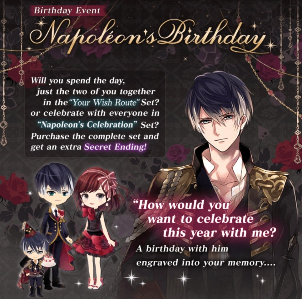To celebrate Napoleon’s Birthday, Ikemen Vampire are offering some story sale deals with an exclusive birthday story, presented in several different chapters with multiple endings.