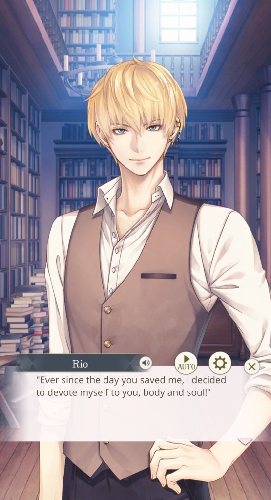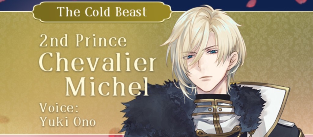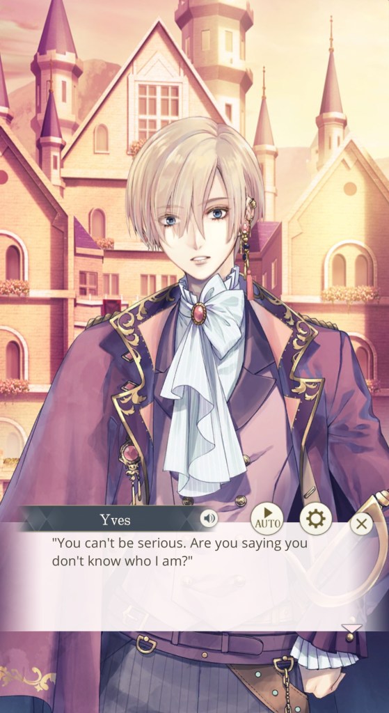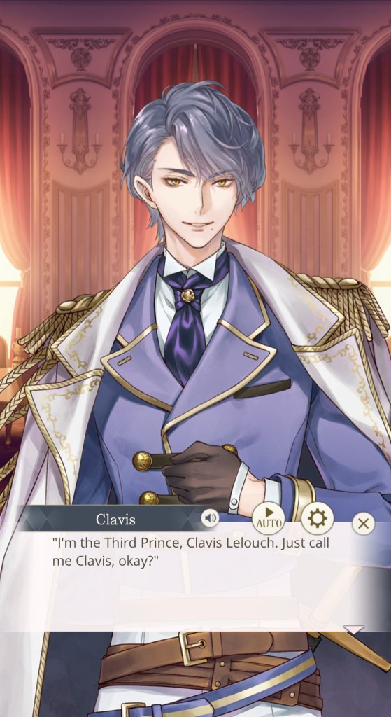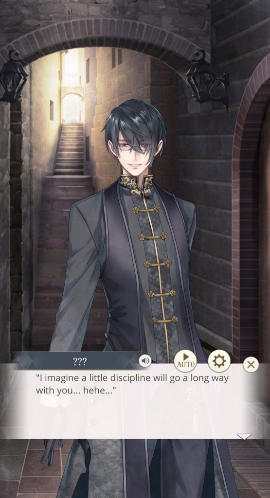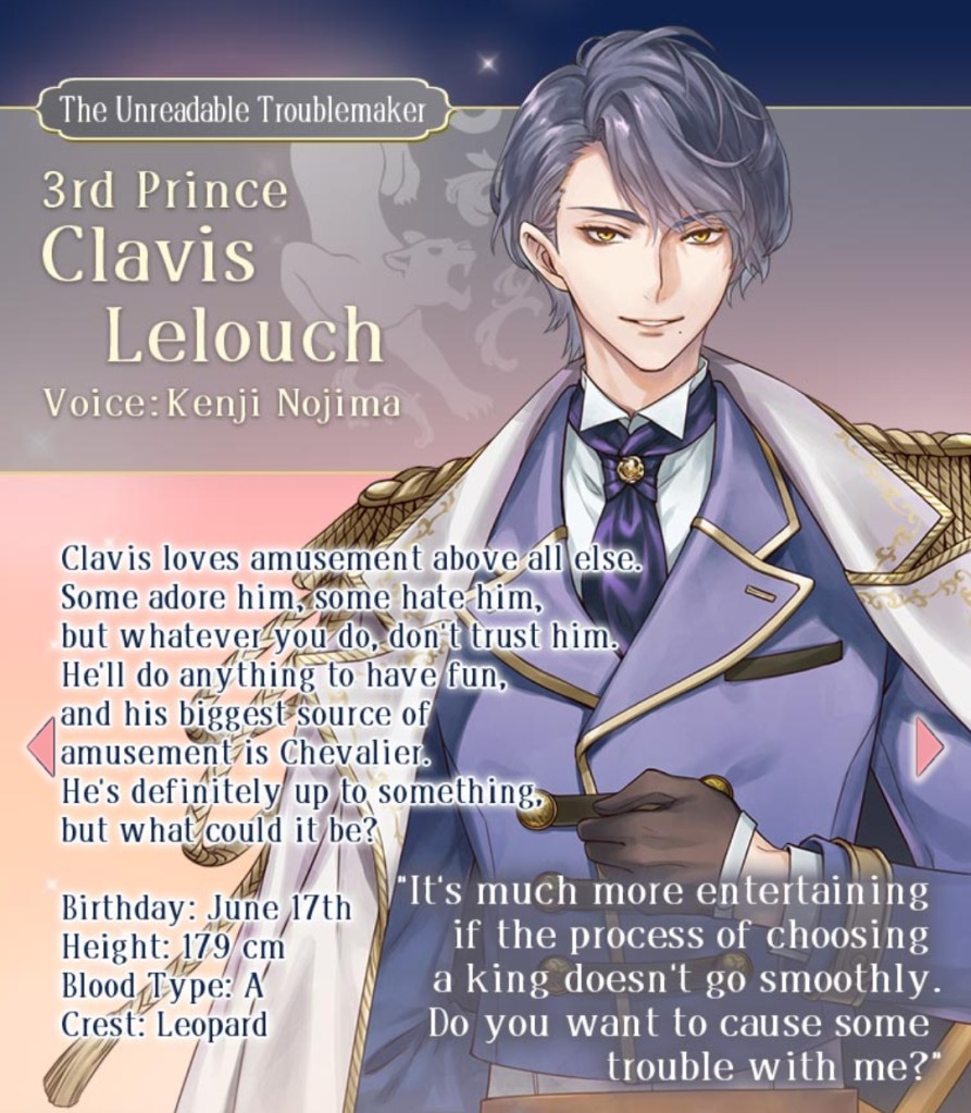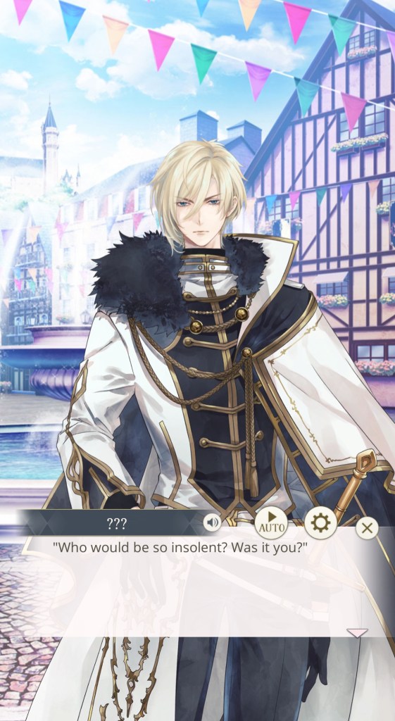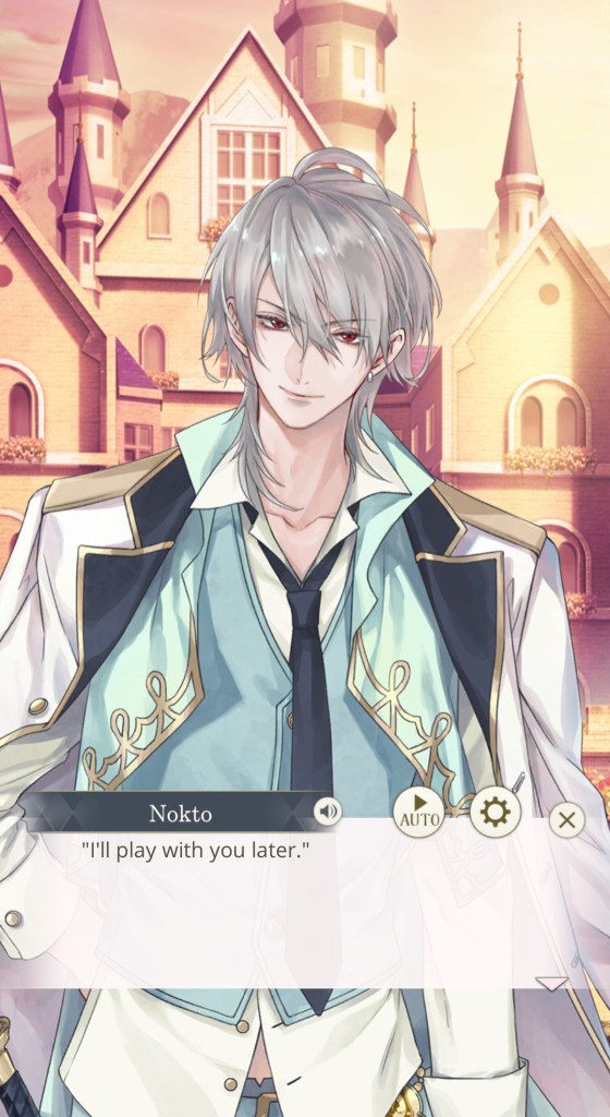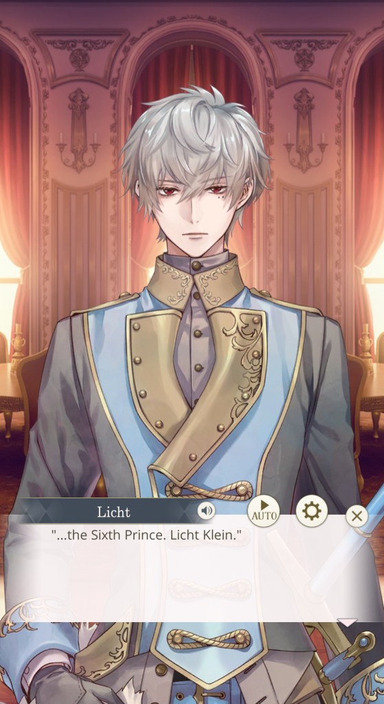 I mentioned this on Twitter, but I would like to thank the artist Kachiru Ishizue for designing Chevalier with the shading on the upper half of his face, just to really emphasise the fact that he’s looking down on us. While he spends the majority of the prologue telling MC she’s irrelevant, it doesn’t seem to come from a place of maliciousness so much as… well, indifference. My current plan is to play his route after Leon’s – I’m really curious to know more about this aloof prince, and he gives off some Ikemen Vampire Mozart vibes that I get the feeling I’ll enjoy a lot…