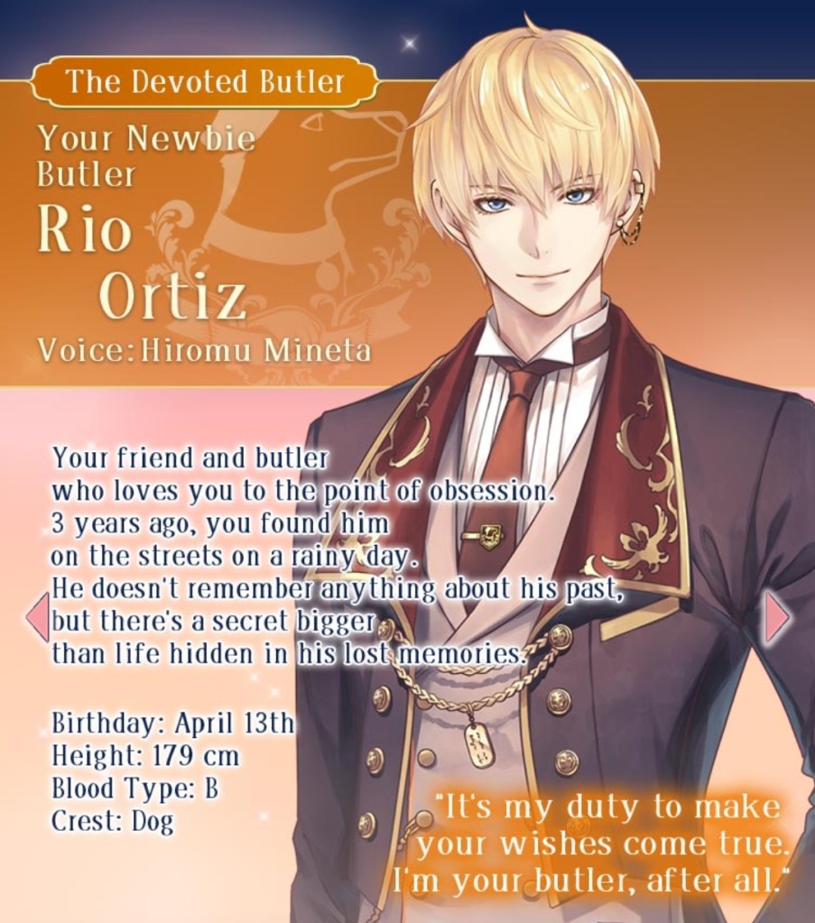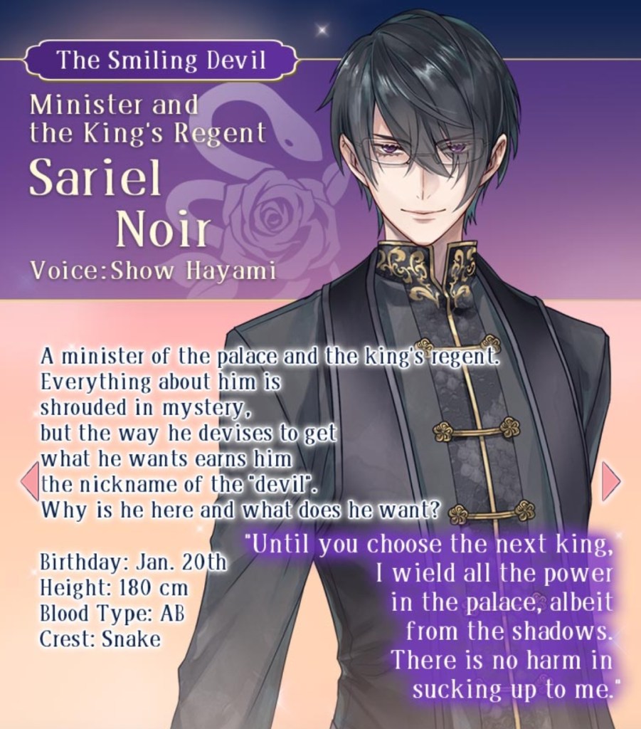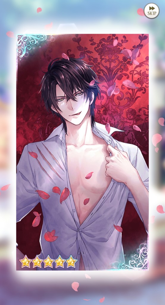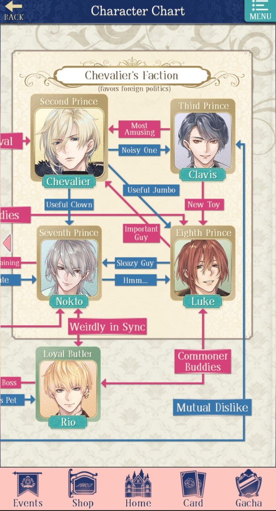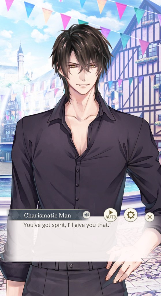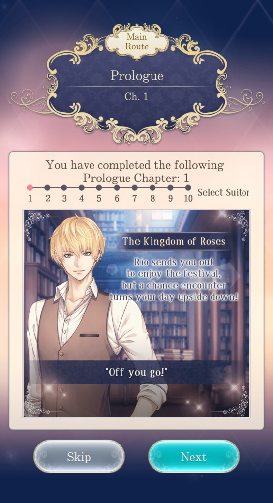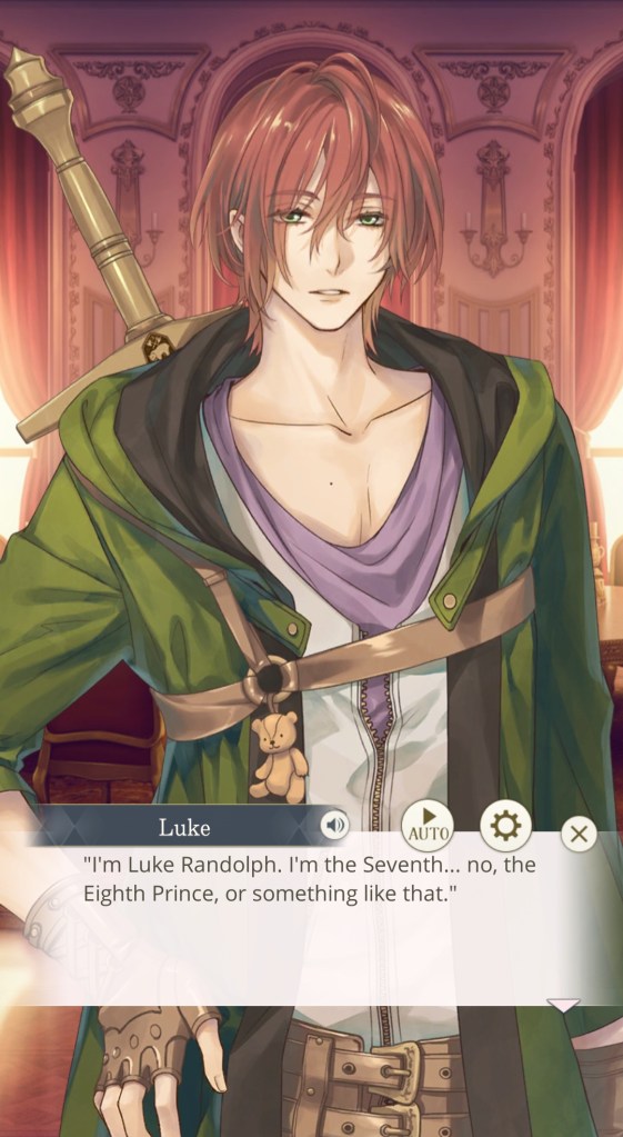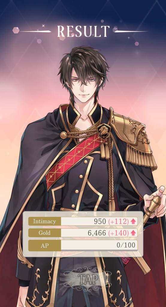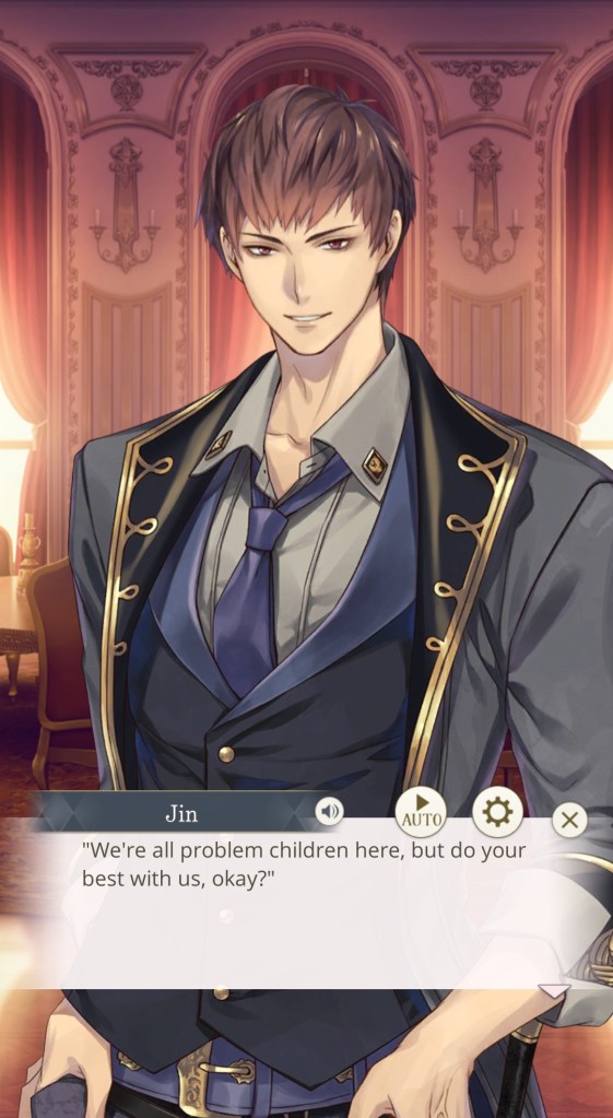 I mentioned this on Twitter, but I would like to thank the artist Kachiru Ishizue for designing Chevalier with the shading on the upper half of his face, just to really emphasise the fact that he’s looking down on us. While he spends the majority of the prologue telling MC she’s irrelevant, it doesn’t seem to come from a place of maliciousness so much as… well, indifference. My current plan is to play his route after Leon’s – I’m really curious to know more about this aloof prince, and he gives off some Ikemen Vampire Mozart vibes that I get the feeling I’ll enjoy a lot…