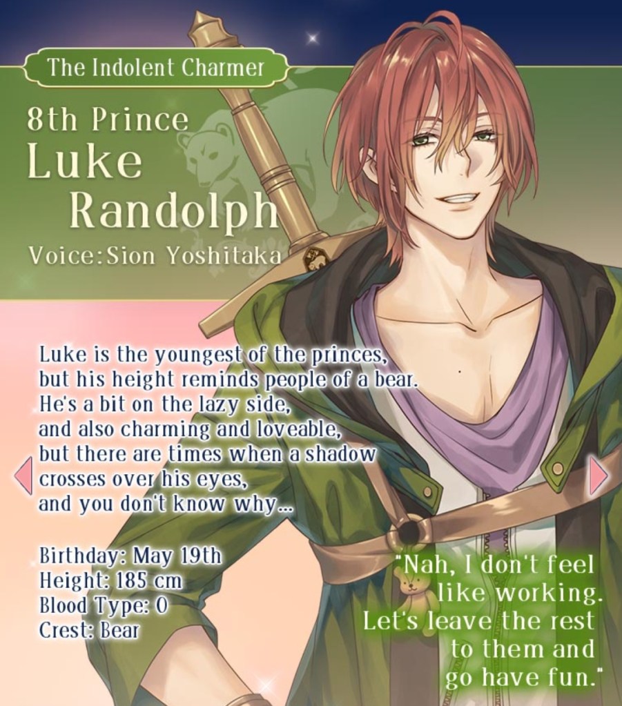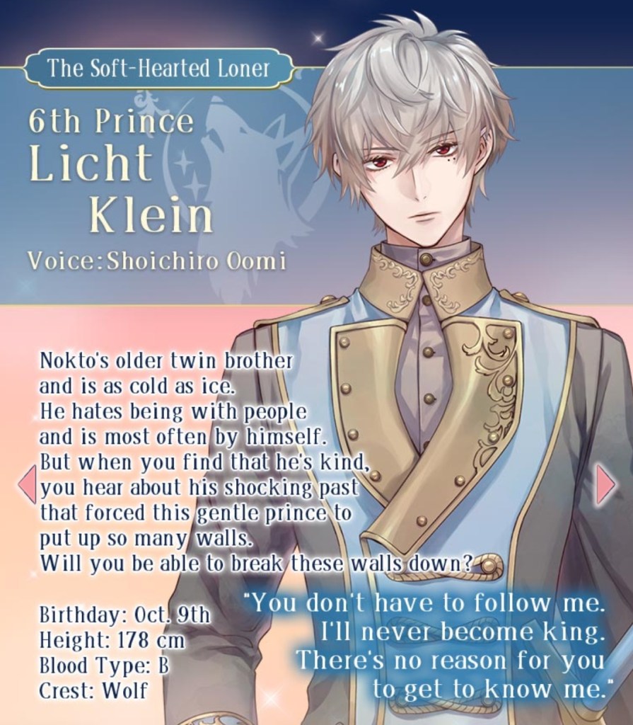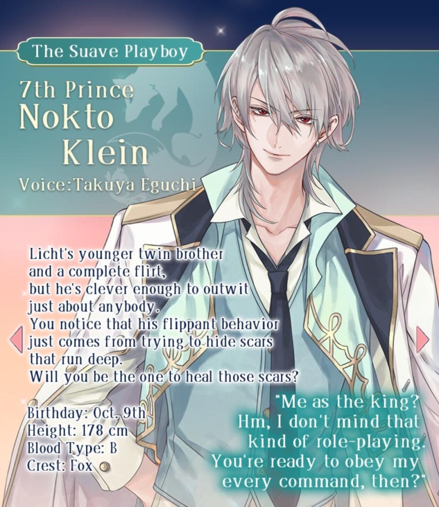Based on the glimpses of the remaining, unreleased love interests in Ikemen Prince, it looks like a varied cast with types to suit everyone’s tastes. Personally, I’m most interested in Nokto, the mischievous playboy with the fox as his crest (silver-haired kitsune!), but I’m also curious about Luke, the lazy, easy-going bear, and Clavis, whose entire introduction in the prologue seems to just be “I like to cause chaos”.