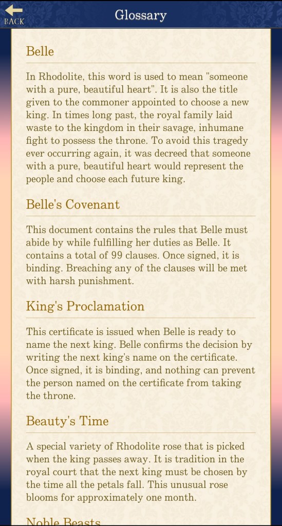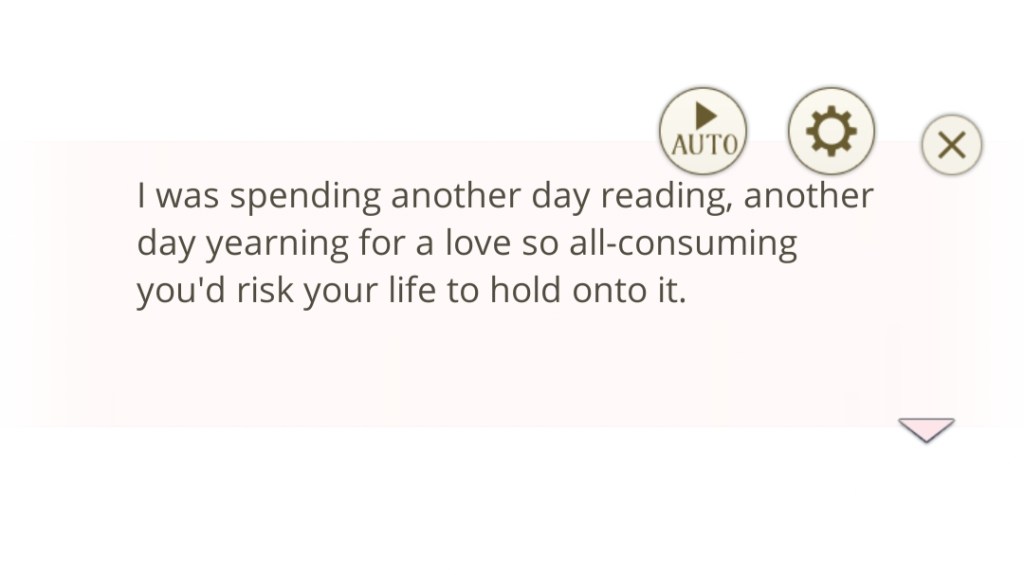 I love the added element of the ‘Beast’, with the princes alluding to darker sides to their otherwise noble personalities. I know some otome game players are tired of the ‘predator vs. prey’ and ‘healing troubled men’ tropes, but, personally, I love these kinds of stories, especially if they’re done in a new or interesting way. It’s too soon for me to comment much on the story (I’ll write a full game review after completing a few playthroughs), but the concept is appealing to me, and I’m always keen for more spicy romances…
