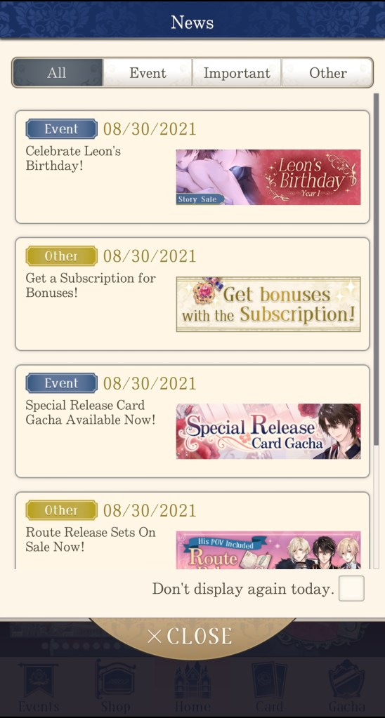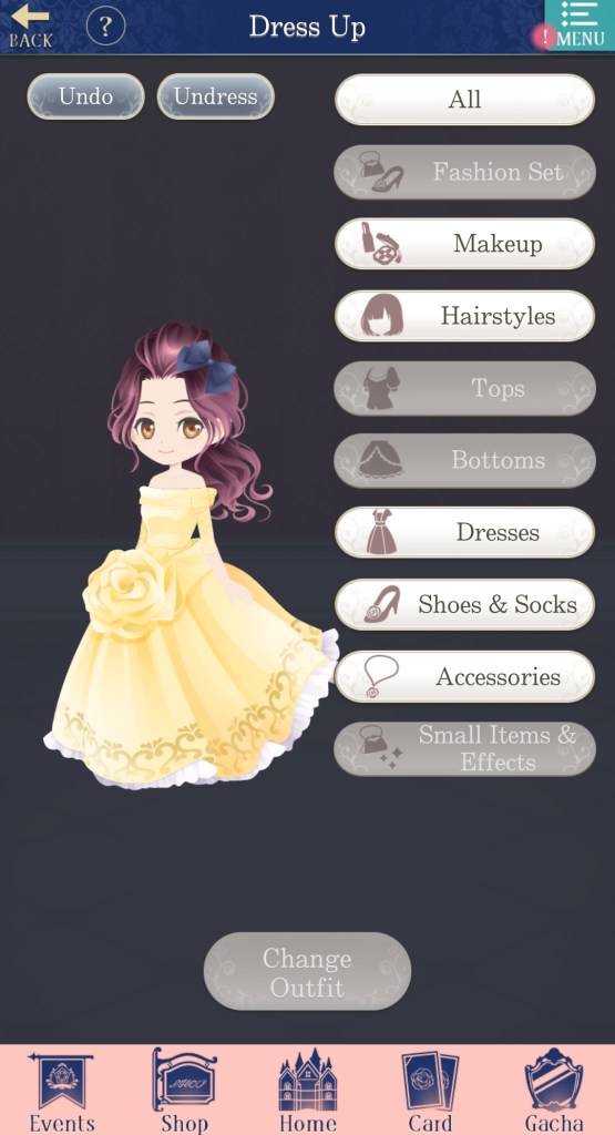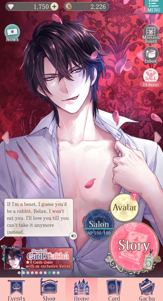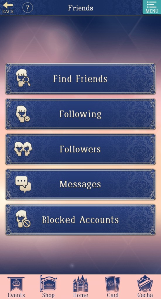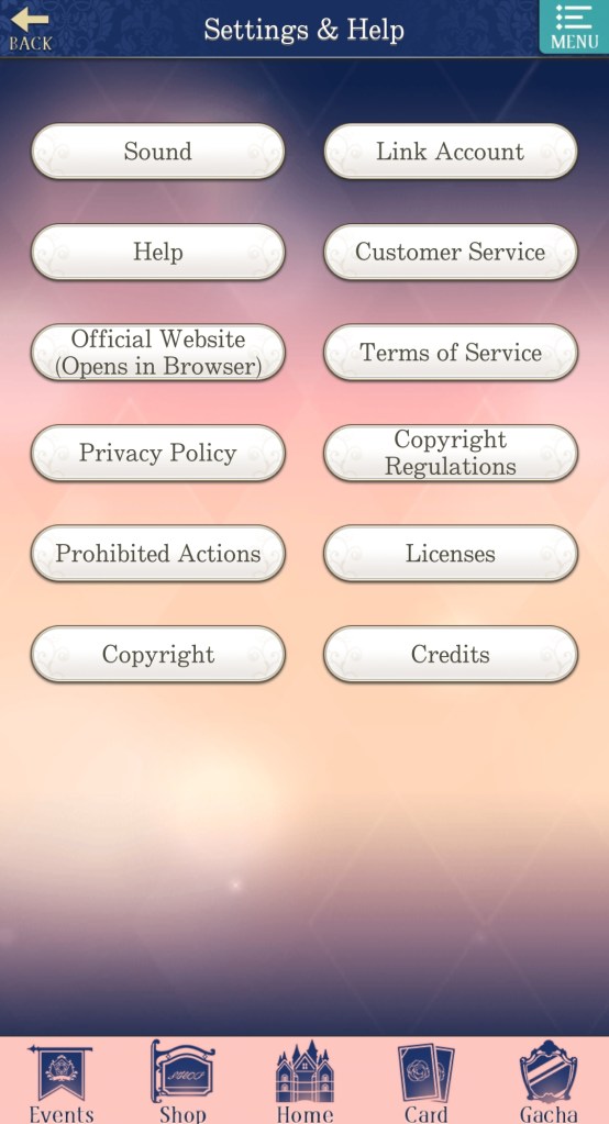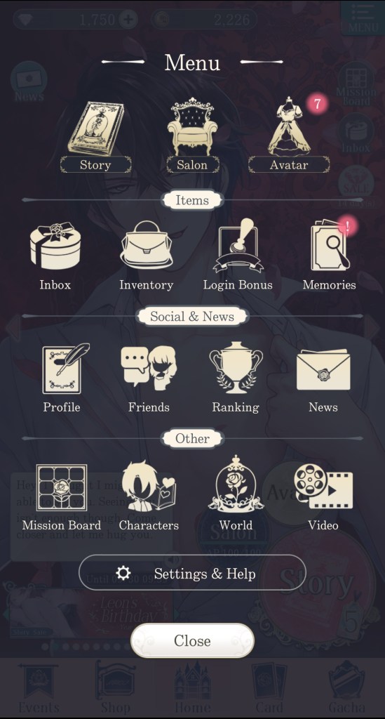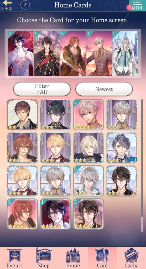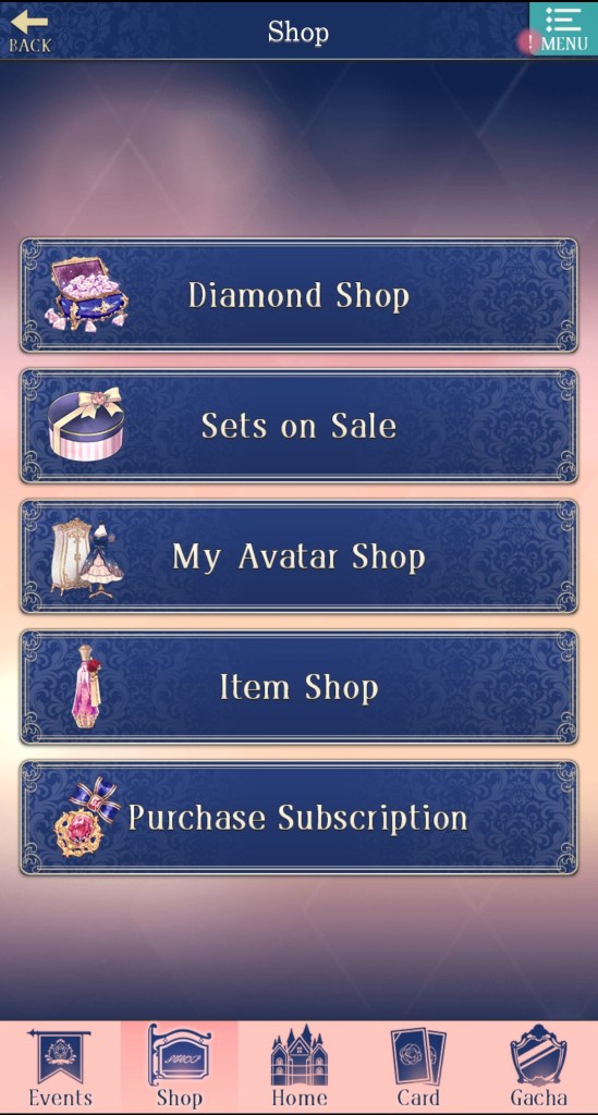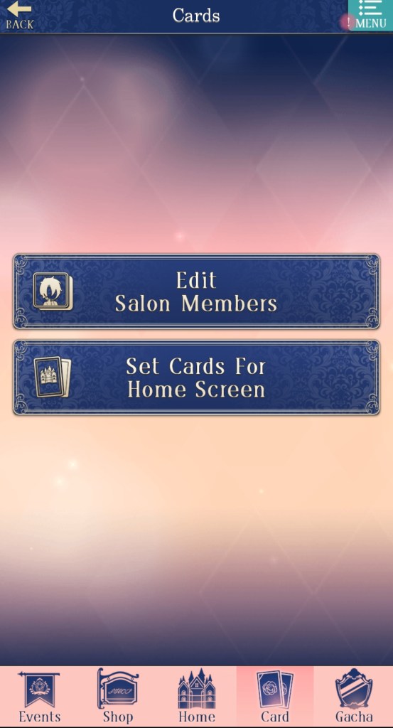 The bar at the bottom of the page has buttons for: Events (showcases any limited-time events happening in the game, including story events, gacha banners, and store sales), Shop (where you go to purchase diamonds, event sets, special stories, and more), Home (returns you to the home page if you aren’t there already), Card (set your deck for Salons and select which cards will appear on the home page), and Gacha (spend diamonds and gold to acquire cards, attire, and items).