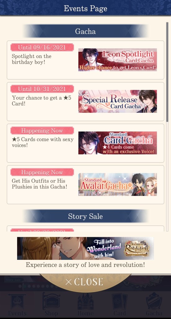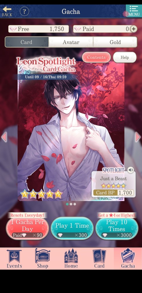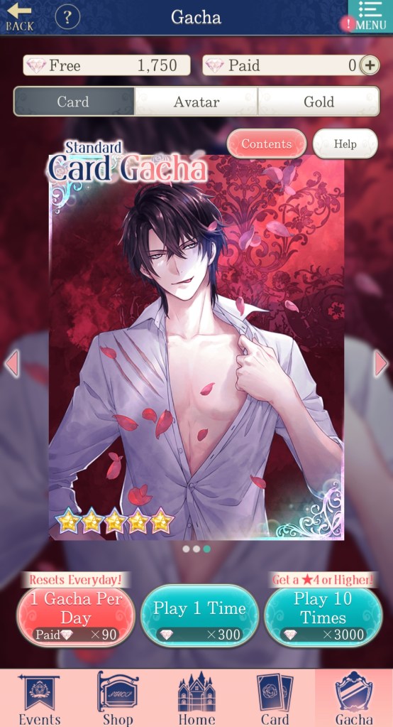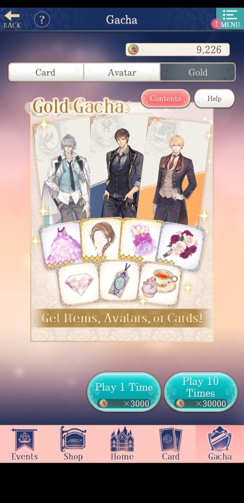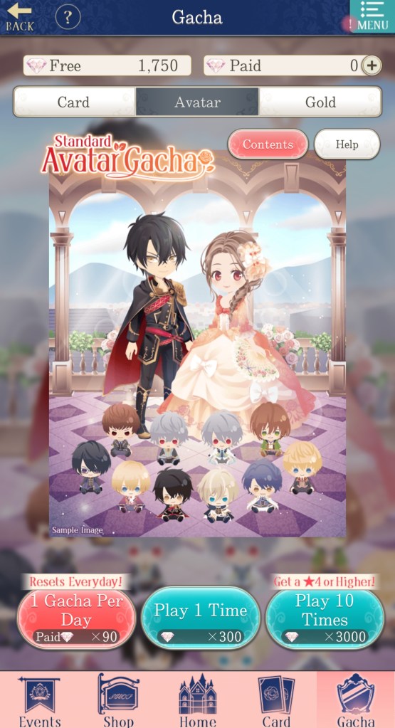 As is typical for a mobile otome game, Ikemen Prince features frequent, limited-time events, as well as several types of gacha. The gacha is probably the part of the game that is the most different from other Ikemen titles, as it allows more options for resources to spend and different types of gacha to choose from, including a daily free pull on the ‘gold’ banner.