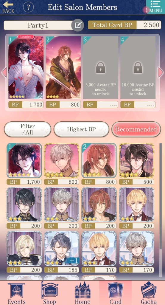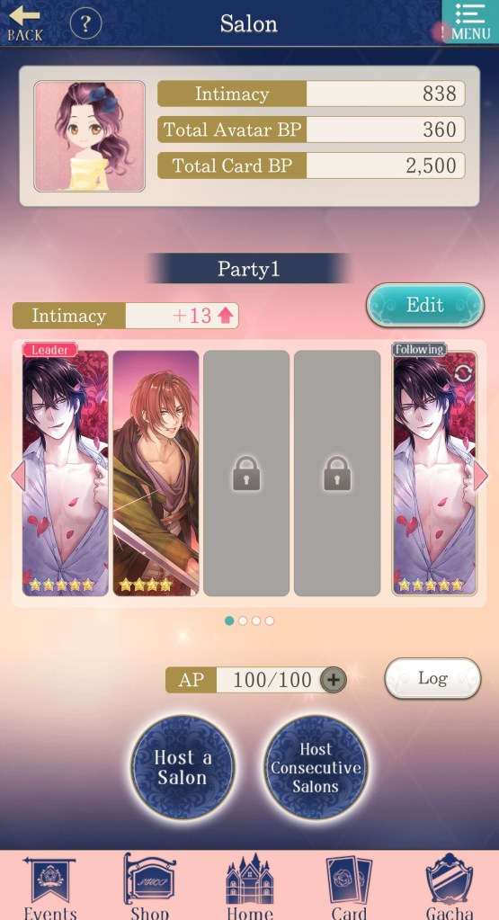 The minigame in Ikemen Prince is called ‘Salon’, which you complete using stamina (AP) and a deck of cards to acquire ‘Intimacy’ points. There is also a gacha feature, where you can collect cards to use in Salons, but there are plenty of free cards provided if you’re not a fan of gacha games.