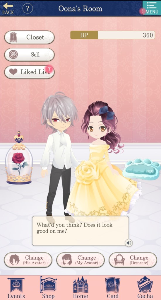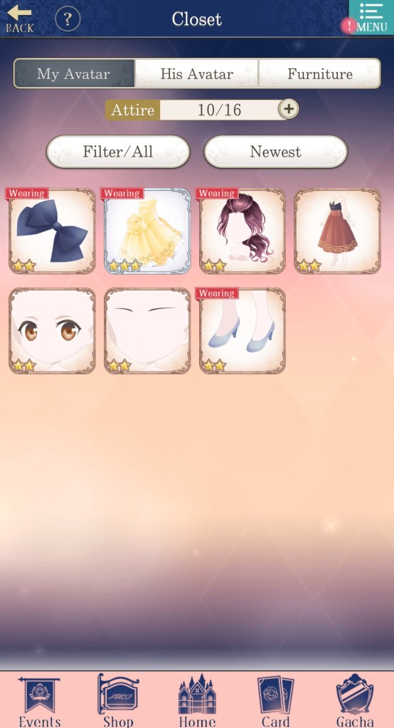 I usually like the Avatar feature of Ikemen games, but I definitely see it as a fun bonus, rather than my primary focus in the game. I collect attire as a I go and I like to try and theme it around my favourite love interest, but unless there’s an event with attire that I particularly love, I don’t usually try to get anything specific.