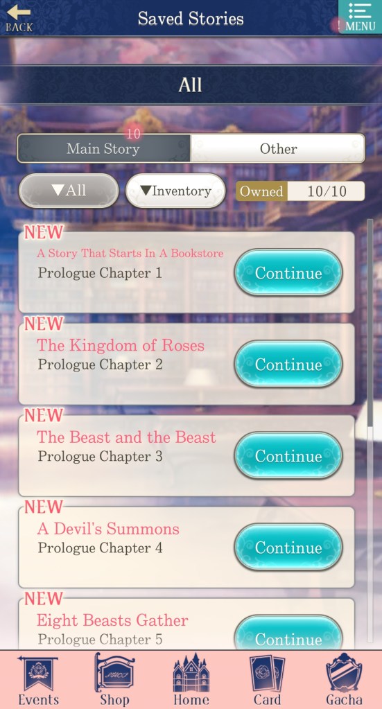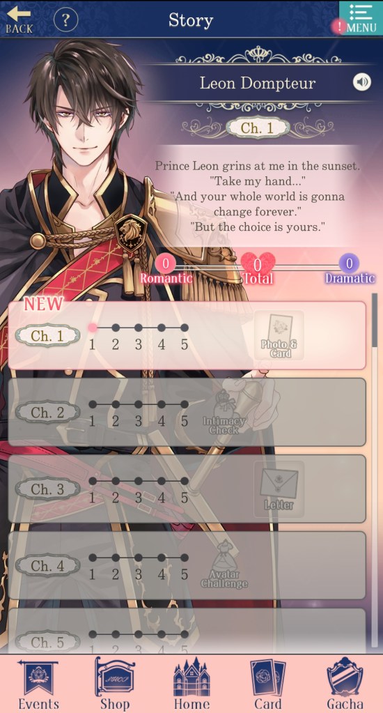 If you’ve played other games in the Ikemen Series franchise, then Ikemen Prince will likely feel familiar to you, as the general layout and structure of the game is similar to other titles by CYBIRD. It features the same, daily 5 x free story tickets (enough to read 1 chapter of the story per day), as well as a minigame to acquire ‘Intimacy’ points, and a player avatar, which you can decorate with attire and other items collected throughout the game.