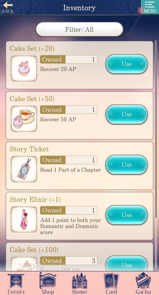 Next is a row of buttons labelled ‘Items’. First is the ‘Inbox‘, which is where you collect any goodies you receive. Then, ‘Inventory‘, which shows you what items you already have available, including expendable items to replenish stamina, boost Romantic or Dramatic points, and increase your ‘Intimacy’ score.