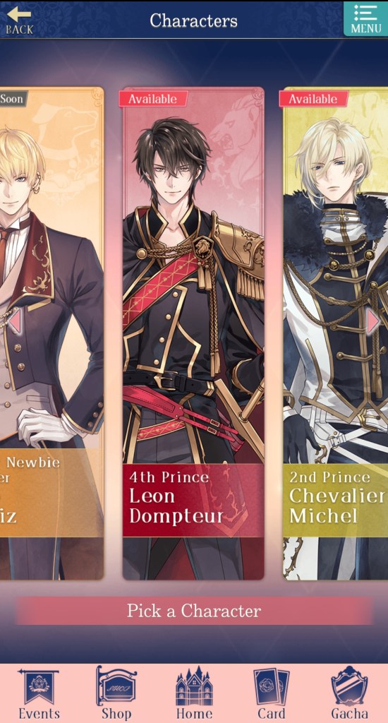 The three currently available love interests are the 4th Prince, Leon Dompteur, the 2nd Prince, Chevalier Michel, and the 5th Prince, Yves Kloss. Including these three characters, there are eight princes, with two non-Prince love interests to make ten LI’s in total.