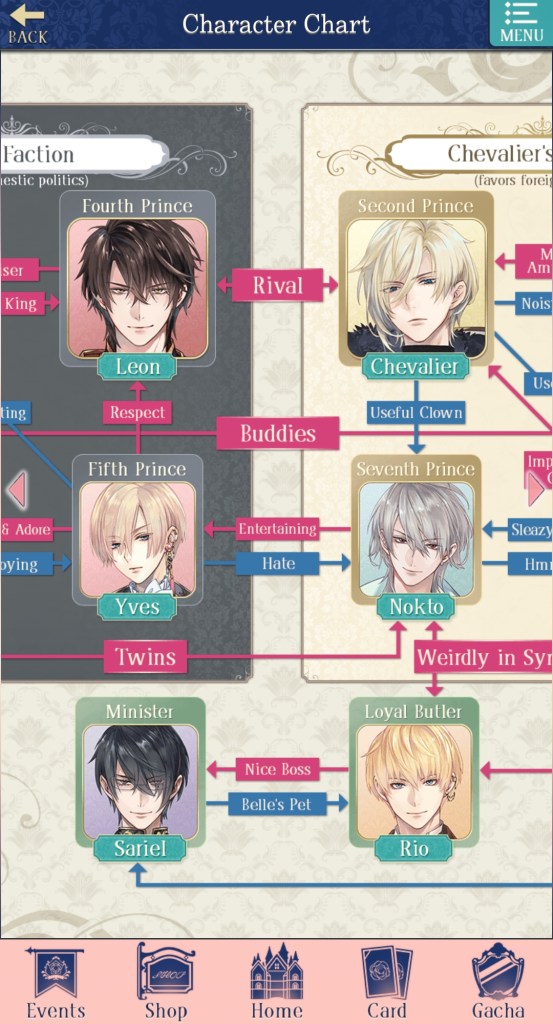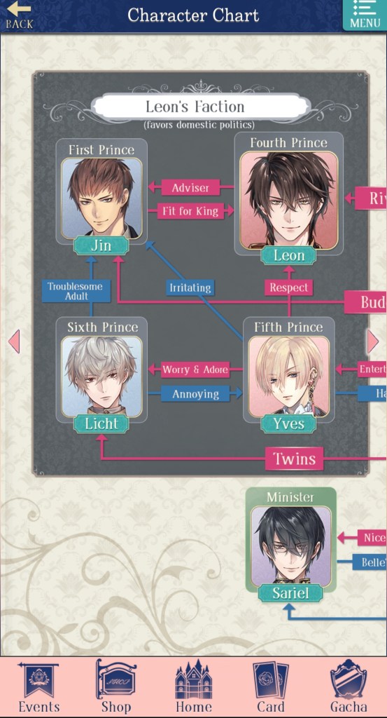 Still, I think the current three characters are well-rounded, covering a range of interests. You have Leon (the noble, older-brother type with a wild side), Chevalier (the perfectionist, haughty prince with walls of ice around his heart), and Yves (a very, very pretty prince with a lot of attitude, presumably to hide his insecurities…). He’s also frequently described as being ‘cat-like’, so if you’re into cute, proud cat-boys, Yves is the prince for you!