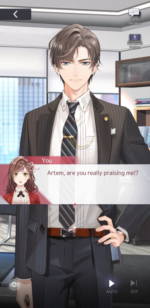 The main story focuses on the non-romantic plot, as such, there isn’t much of an opportunity to romance Artem, but you do get to spend time working on cases with him, particularly in Chapters 1 and 3. Despite the lack of romance, it’s actually a good opportunity to get to know his character and experience the dynamic he has with MC before any romance is introduced, especially in regards to how they work together.