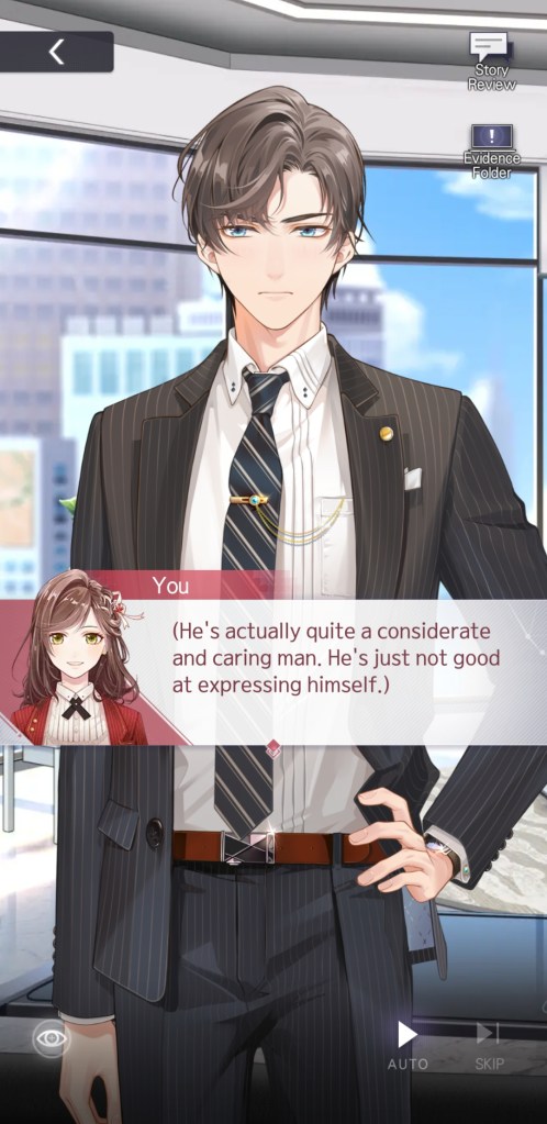 In fact, he admires MC and often boosts her confidence when she’s feeling unsure by reminding her of how capable and intelligent she is. His gentle smile and awkward blush when he’s caught off-guard will make your heart flutter, even if he’s not your favourite. In short, there’s nothing to dislike about Artem, and you can’t go wrong reading any of his stories. (I also recommend tugging his tie in the ‘visit’ interactions, if you haven’t already!)
