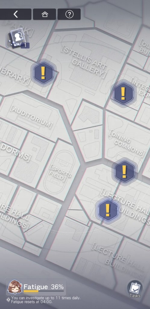 Conducting these investigations is how you unlock story parts and complete event tasks for rewards, but doing so will also fill you ‘fatigue‘ meter, which limits the number of investigations you can complete on a daily basis.