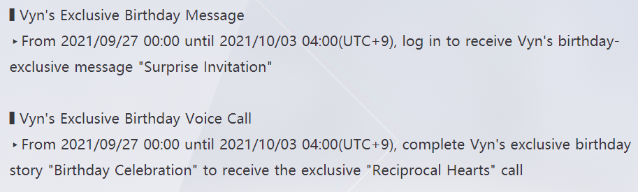 Log-in between 27th September and 3rd October to receive a birthday message, “Surprise Invitation”. 27th September is Vyn’s birthday and 3rd October is the day the event ends, so if you log in between his birthday and the end of the event, then you’ll receive his message.