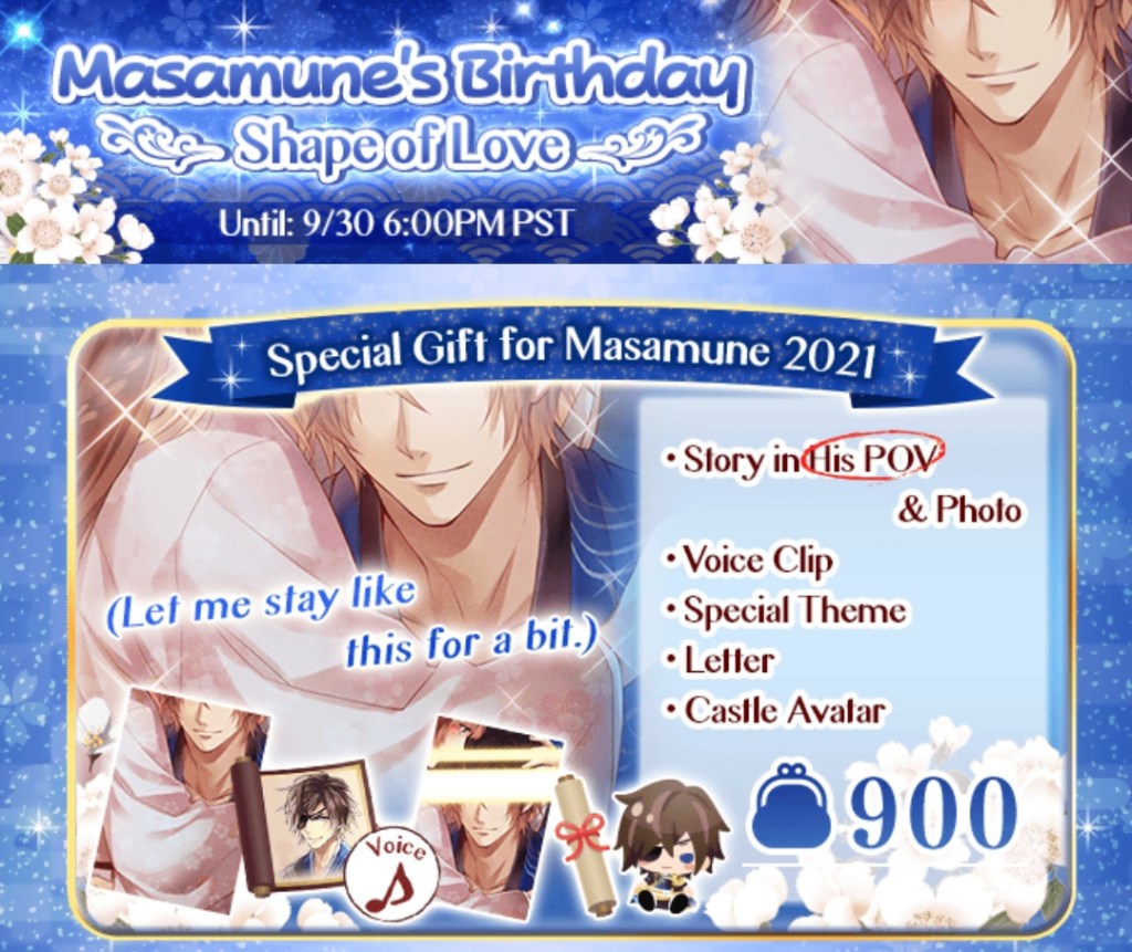 Event Features: Purchase a new Birthday story with Date Masamune, written from his point of view, in a special bundle including a voice clip, ‘His Room’ theme, letter, and castle avatar items!