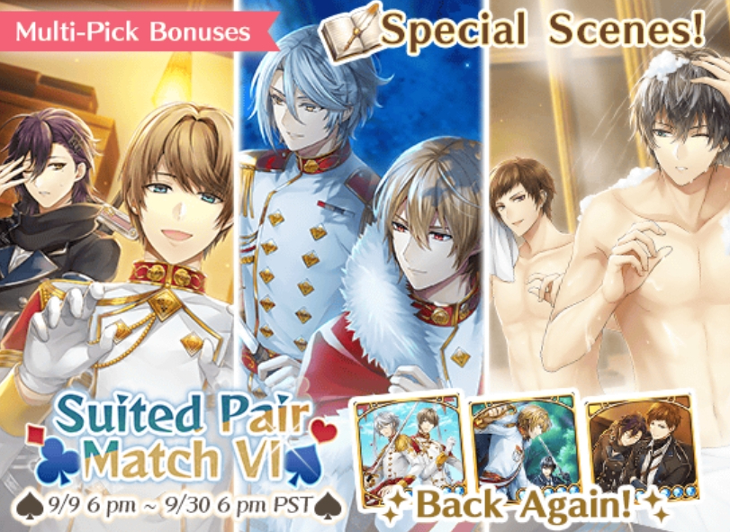 Event Features: Collect cards featuring not one but two ikemen in the Suited Pair gacha series. Three new cards (with new pairings!) have been introduced, and previous Suited Pair cards have been brought back for a limited time.