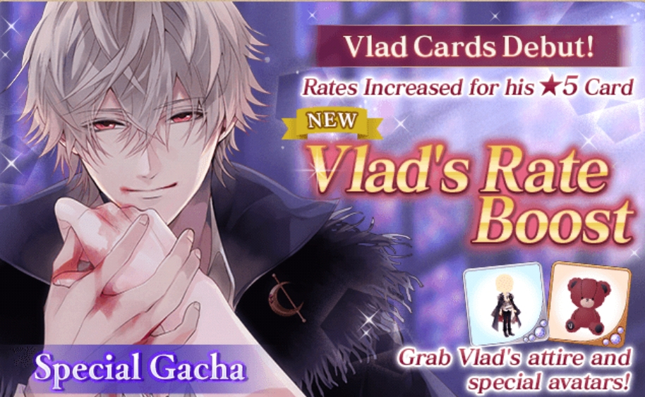Coinciding with Vlad’s Story Sale debut, Ikemen Vampire has also released a Special Gacha event to celebrate his card debut. Vlad’s first 5-Star card has been added, along with his avatar attire and a matching teddy bear, which all have boosted rates for a limited time.