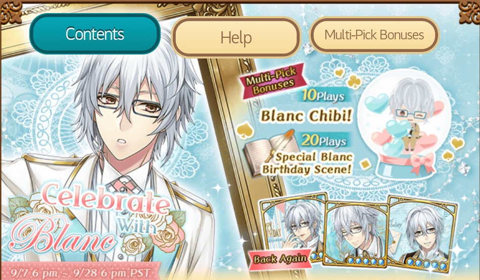Celebrate Cradle’s White Rabbit with temporarily boosted rates for Blanc’s cards, including special Birthday-themed cards! There are also multi-pick bonuses, which are rewards player’s receive for playing the gacha a certain number of times. You have a 50-50 chance of receiving one of the two rewards at 10 rolls, and you’ll receive the other reward at 20 pulls.