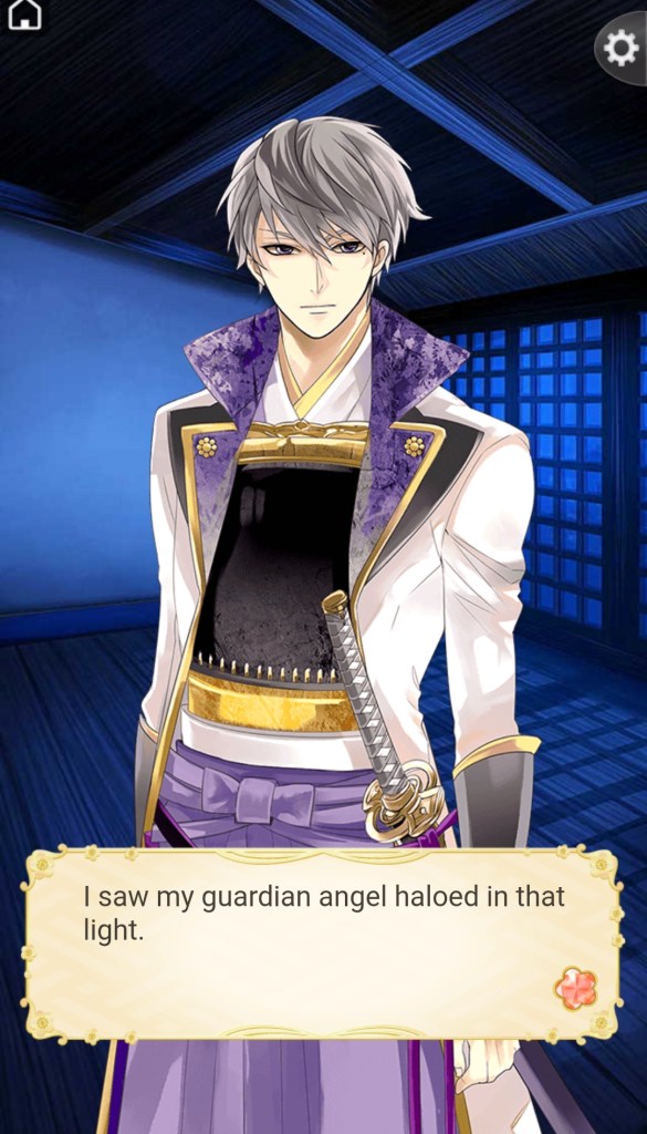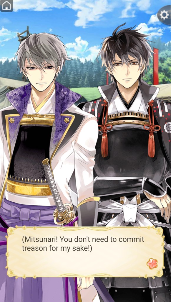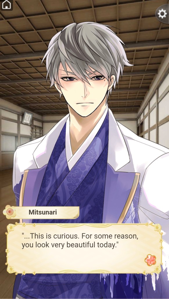 As for his personality, Mitsunari is a gentle, kind character, with an accidental suave side. His innocence means he doesn’t always understand the implications of what he’s saying or doing, so he can get away with being relatively affectionate towards MC earlier in the route than some of the less-than-innocent warlords.