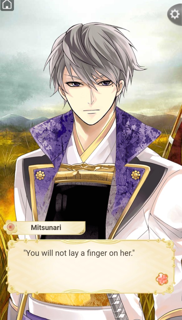 I should start off with a quick disclaimer that Mitsunari’s character design just isn’t my cup of tea. I don’t think he’s a poorly designed character– he’s just not my type. However, Mitsunari is probably one of the best examples I’ve seen of a gentle, sweet-hearted love interest. This is particularly impressive given the game’s context of war and violence – the sengoku era of Japan.