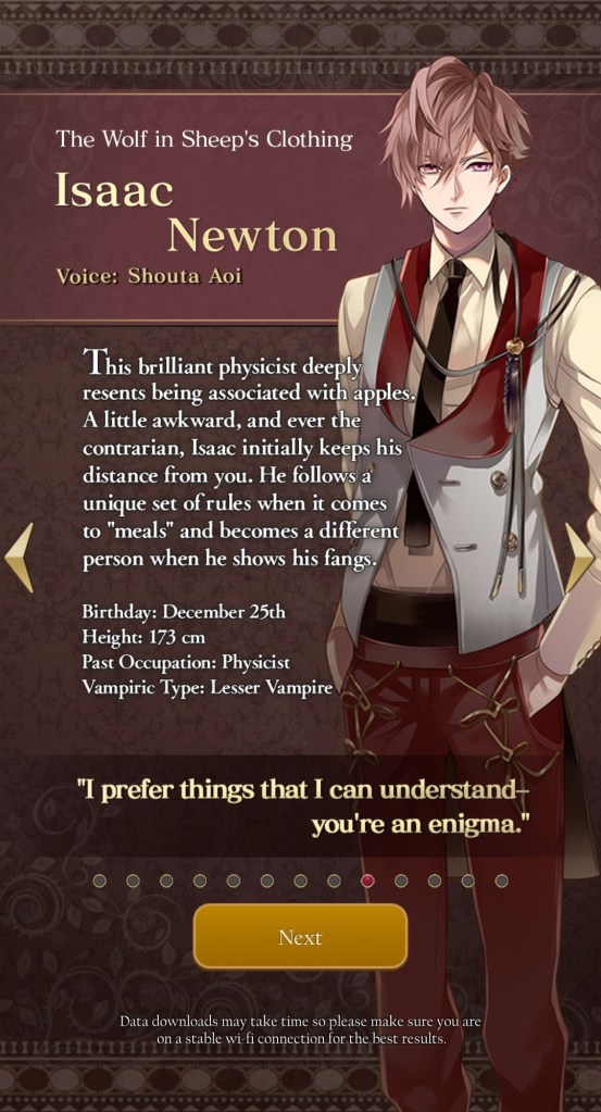 You’ll like Isaac Newton if you like: Younger, innocent love interests; prickly tsunderes with a gooey centre; having to work hard for your love, with a satisfying payoff in the end; stories that focus more in the relationship between MC and the love interest than the non-romantic plot; and historical otome games that include creative references to the original historical figure…