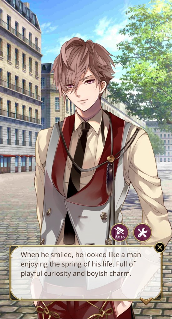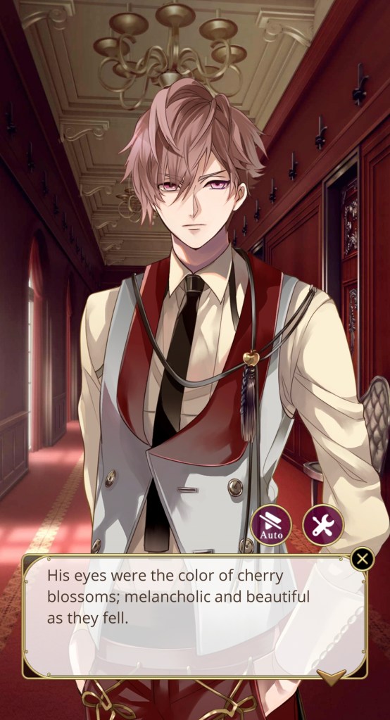 Isaac is a smaller, lithe man who’s less traditionally-masculine than some of the other residents of the mansion, adding some aesthetic variety to the cast. In the first chapter of his route, Isaac is described in a beautifully-poetic passage that likens him to cherry blossoms – a youthful man in the spring of his life.