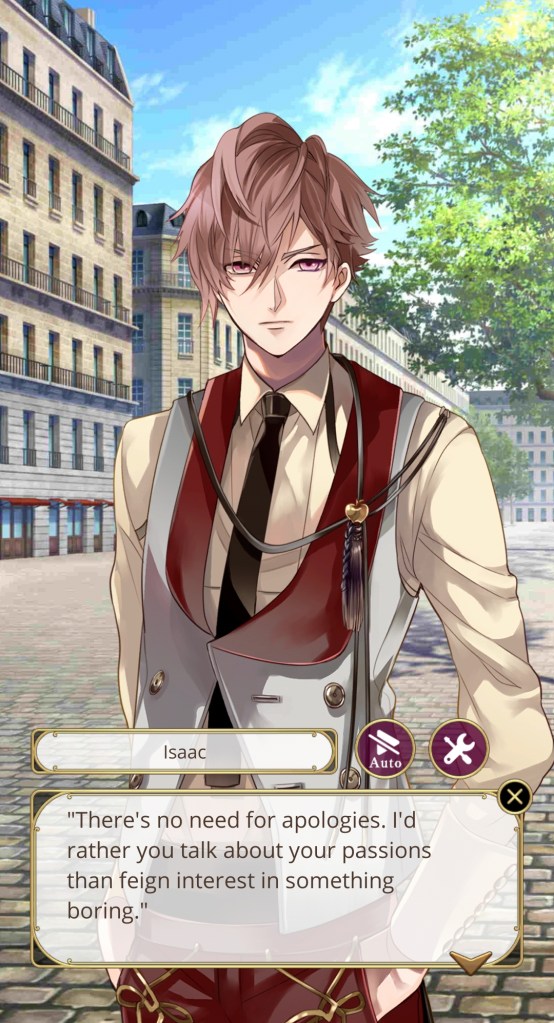 If you prefer to play a more proactive MC who has to take charge with a love interest who seems a little more innocent, or naive, then you’ll likely enjoy the dynamic between Isaac and the protagonist. There’s the classic ‘Shota’ archetype scene where MC has to nurse the love interest when they come down with a cold, so there’s plenty of story content to appeal to otome players who like to take care of their love interests.