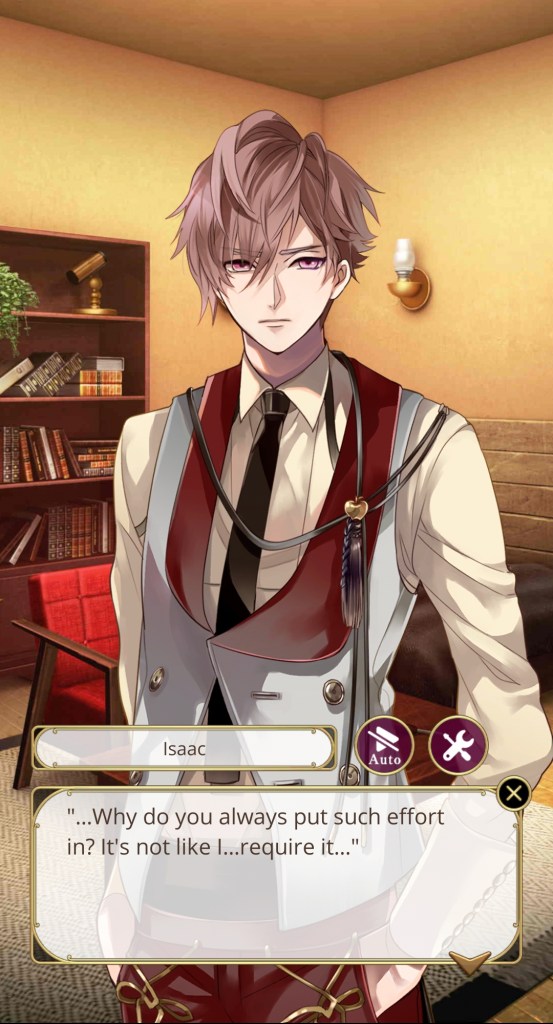 Despite taking place early in the route, this side story is an adorably sweet moment that grants some interesting insight into Isaac’s character. It feels different enough from the main story version of the scene (written in MC’s POV), that it’s not just the same moment rewritten in Isaac’s POV with a few extra lines inserted. Furthermore, as Isaac is still quite shy around MC at this point in the story, his inner monologue is far more talkative and eloquent than his dialogue.