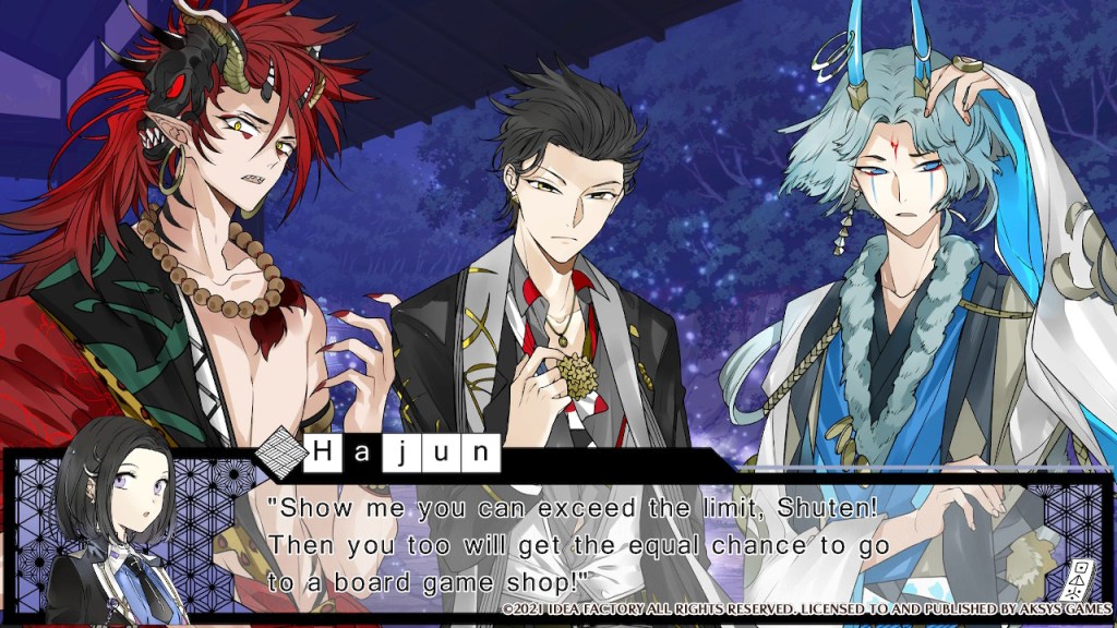 If the Dairoku team are considering making DLC or a sequel at any point, I’d like to put my vote in for Shuten – the genki himbo Oni who stole my heart. If I could be greedy and put in a second vote, I’d also like Hajun to be a dateable character. But then Ibaragi might feel left out… so maybe an Oni DLC would be best….