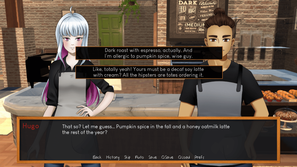 Hugo is a charming, flirty barista whose aspirations lie in the music industry. He’s introduced last in the demo, so I didn’t get quite such a strong feel for his character, but this just means I have more to look forward to in the full release. That being said, his cheeky charm is made apparent from the first impression, so I’m not sure if this will be consistent throughout the story, or if there’s something more lying beneath his carefree smile…