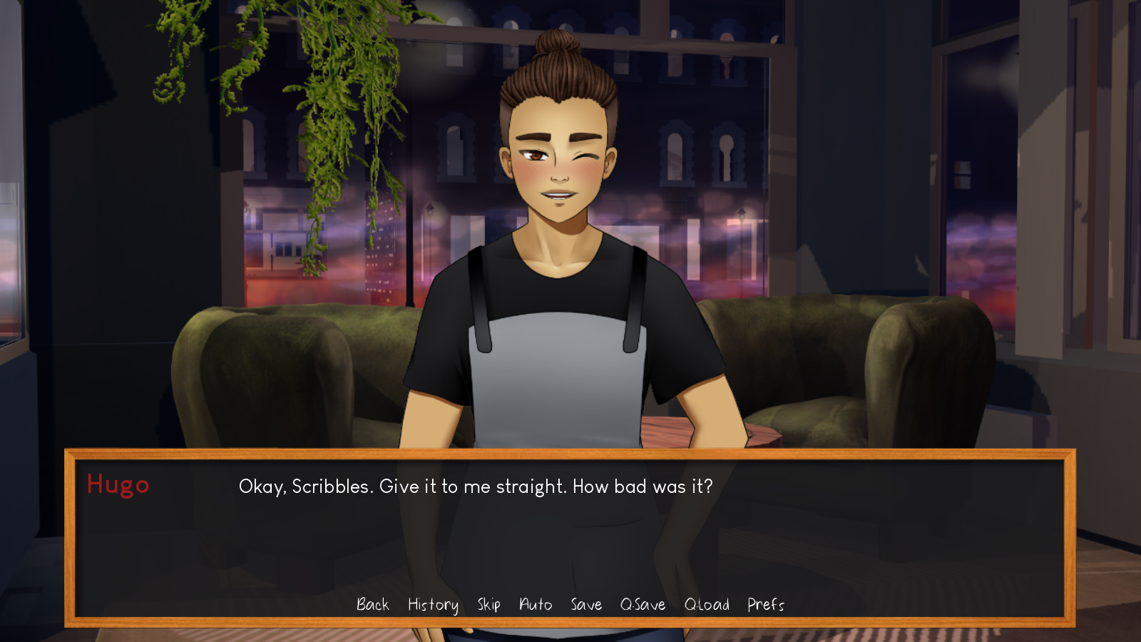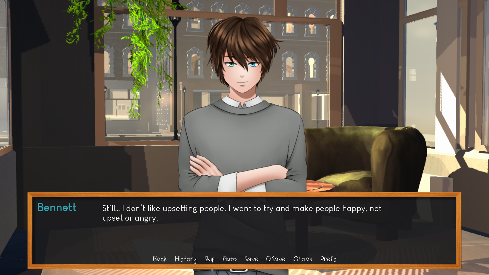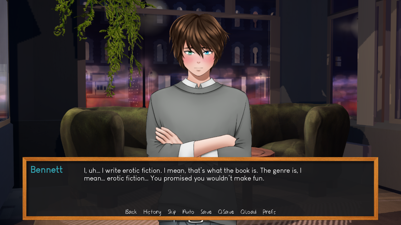 Bennett is a bashful, thoughtful writer of erotic fiction — which is excellent and I’m very excited to romance him in the full game. Depending on the choices you make, you may unlock different scenes with him, so I recommend playing around with the player choices to make sure you get the full experience.
