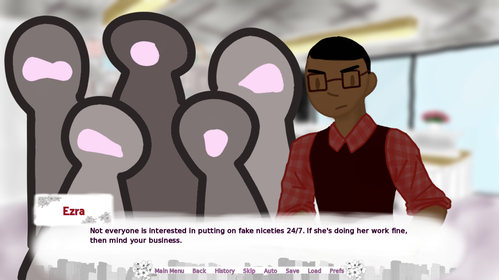 Ezra was a little difficult to get a read on at first, but I loved how his relationship with MC developed naturally and organically. He seems like he’ll be more of a slow-burn than Adrian and Logan, but I get the sense that he’ll be worth the wait. He’s also a great ‘friendship’ option if you’re looking for a more platonic experience, as I could easily see him and MC becoming workplace buddies.