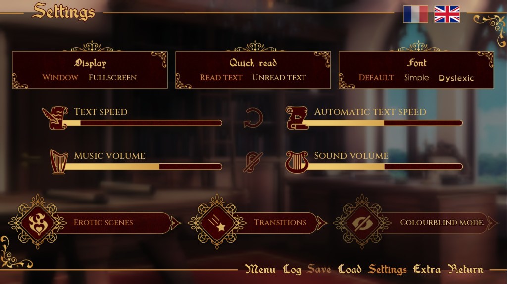‘Imperial Grace’ features all the visual novel staples, along with some optional resource management mechanics that affect not only the story outcomes, but also the player choices you have access to. There are also several accessibility settings that can be accessed via the main menu, so it’s worth playing around with some of the preferences to optimise your gameplay experience.