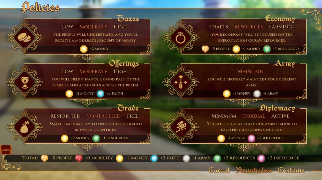 I personally love fantasy and historical fiction, so a medieval otome game is right up my alley, and I love nation-building games like Crusader Kings and Civilization – so I particularly enjoyed the incorporation of resource management gameplay, including setting your policies (such as taxes and trade regulations), and answering the petitions of your subjects.