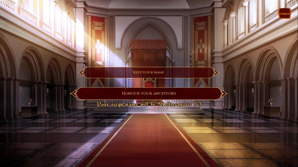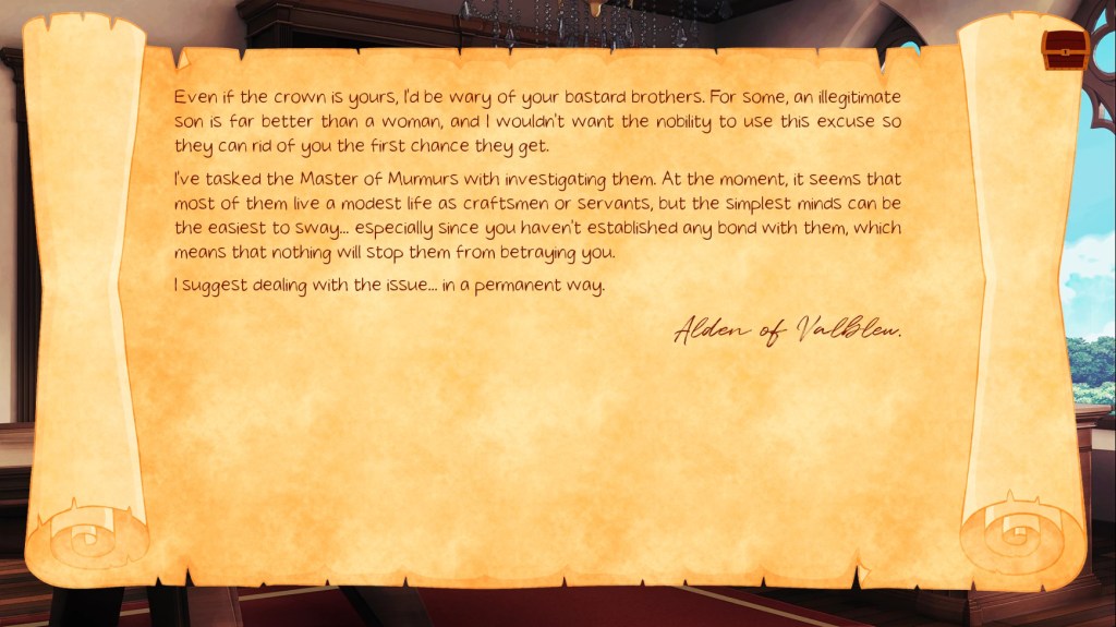 I love the idea of making different layers of the game optional, as it makes the experience more accessible for different types of players. I personally enjoyed these added gameplay features, as it helped me to feel more immersed in the setting from MC’s perspective as Empress and ruler of a nation, not just the protagonist of a romance story.
