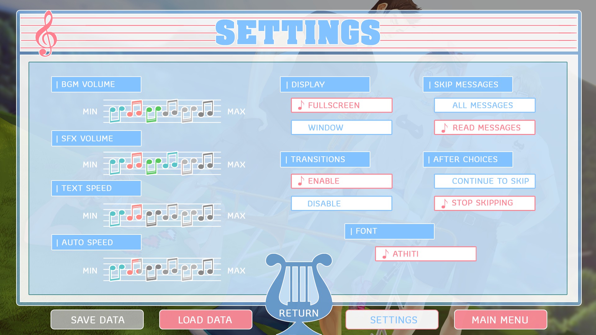 What struck me first when I opened the game was the preppy background music in the main menu, which simultaneously establishes the theme and builds excitement. This is complemented by the playful colour palette and the interface’s musical aesthetic – all together creating an overarching upbeat, energetic atmosphere.