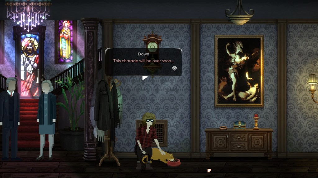 But… is it “cat”? I can definitively say that Cat’s Kiss is *not* “cat”, or at the very least, it isn’t the same kind of game as Stray. There’s no intent to immerse the player in a cat-like perspective, nor does the cat character actually act like a cat. You don’t get to scratch furniture, knock things off ledges, or chase red laser pointers, and experiencing the game as a cat isn’t the point at all.
