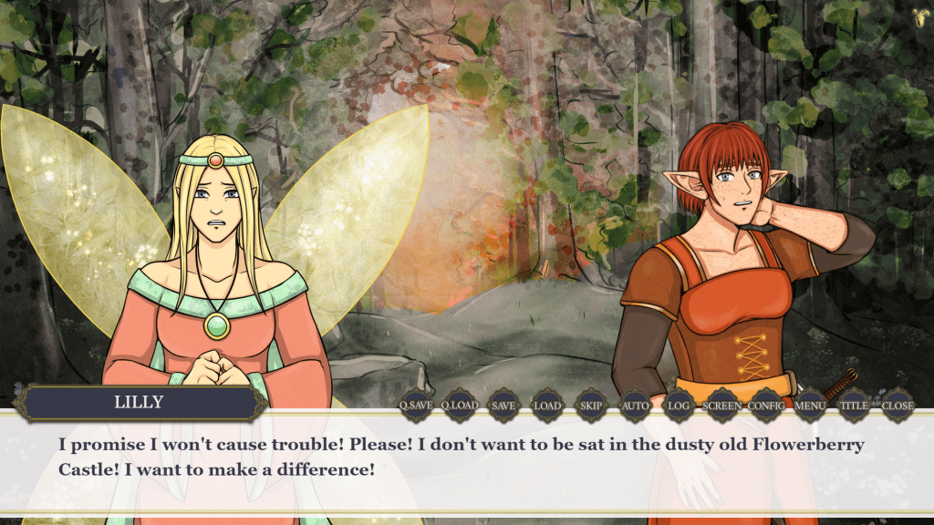 In regards to Royal Duality specifically, it features an illustrative art style that departs from the classic, anime-inspired aesthetic, with a variety of background art and character sprites. I liked the background visuals in particular, as the style lent itself well to the fantasy theme, and the number of variations emphasised the journey aspect of the story.