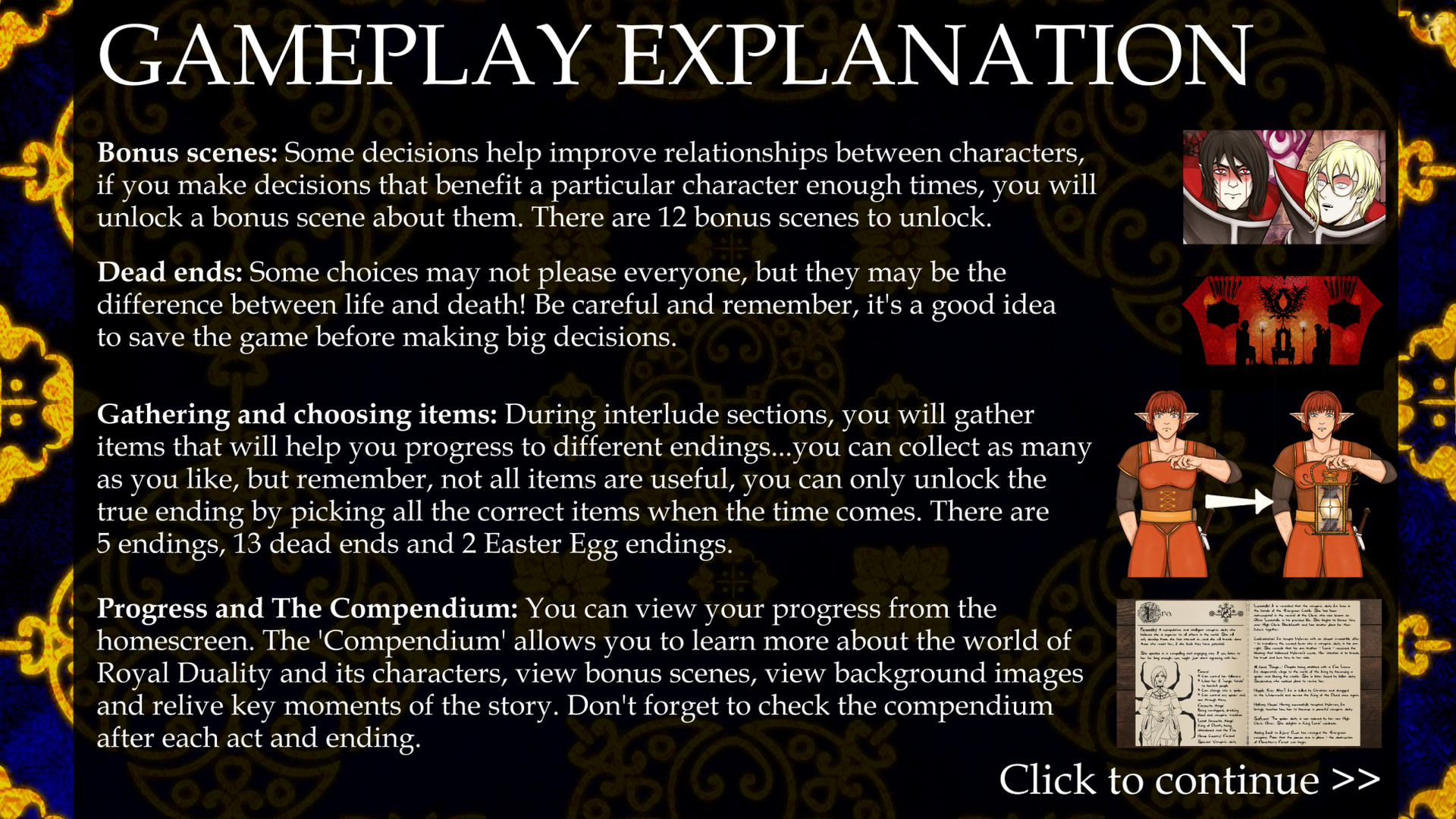 In the case of Royal Duality, I think adding some more action to break up the conversation could have helped. As it stands, I finished the opening chapter feeling much like I did while watching the first season of Game of Thrones – intrigued, but also a bit overwhelmed by all the names, faces, and places I couldn’t possibly hope to remember… at least, not without some sort of guide (but thankfully, there’s the Compendium to check in on!).
