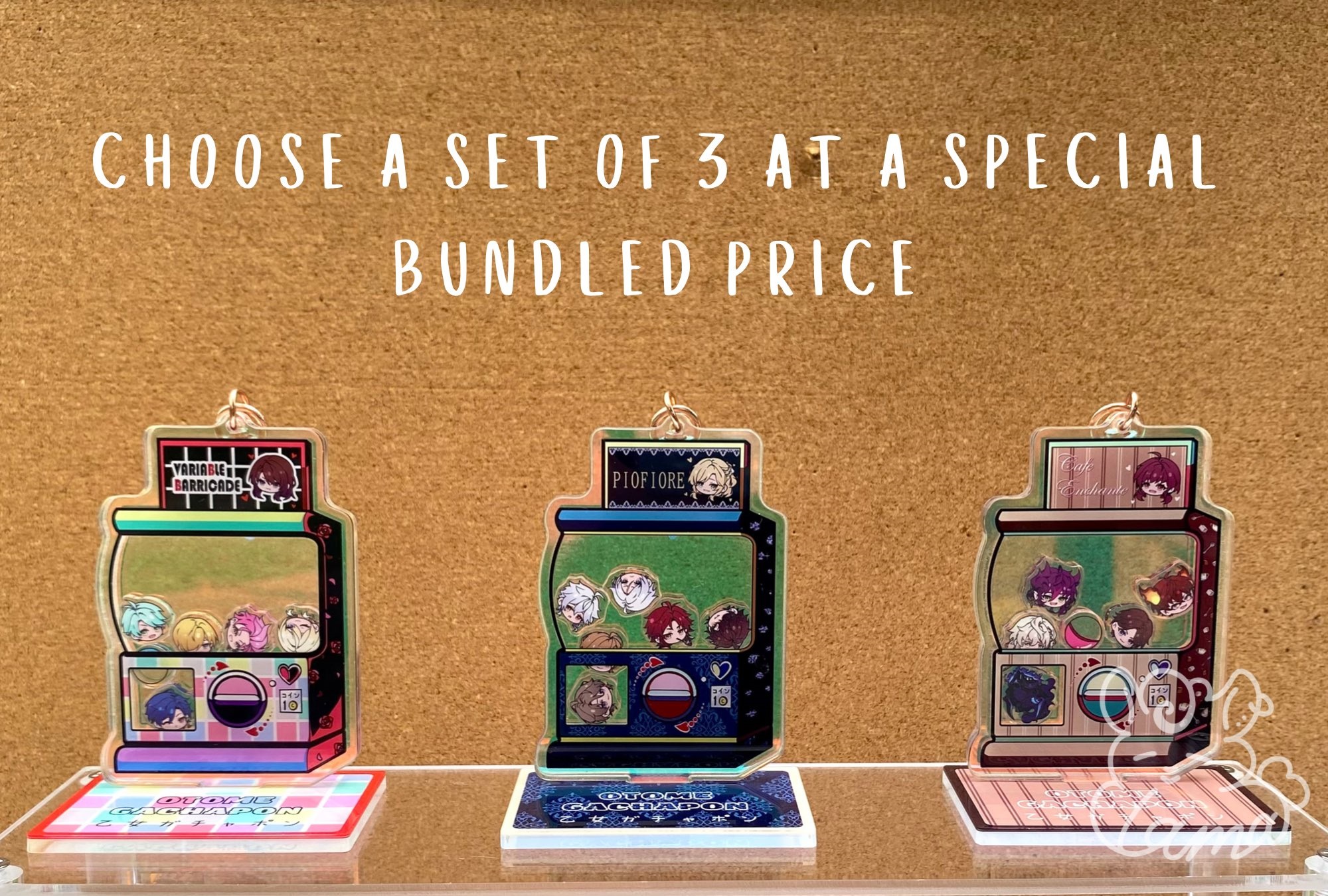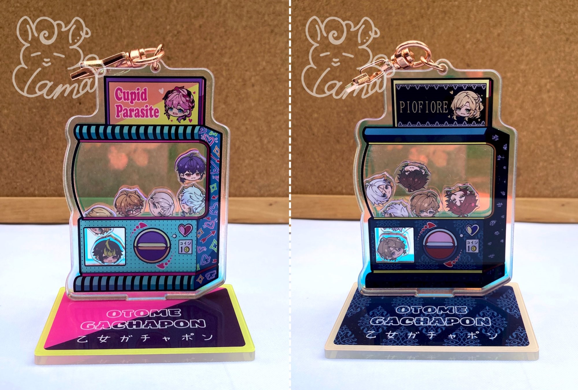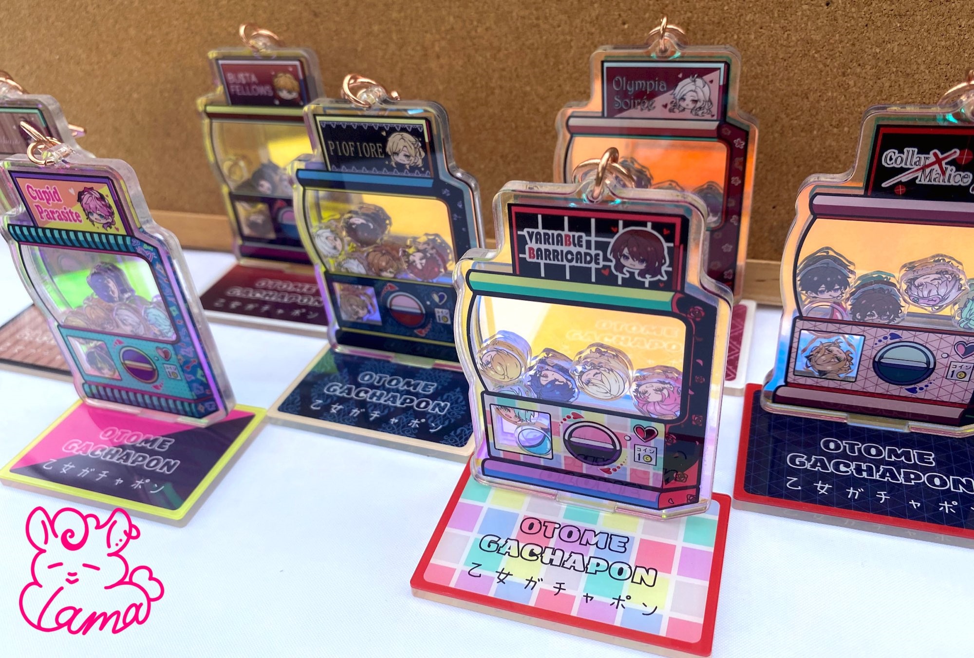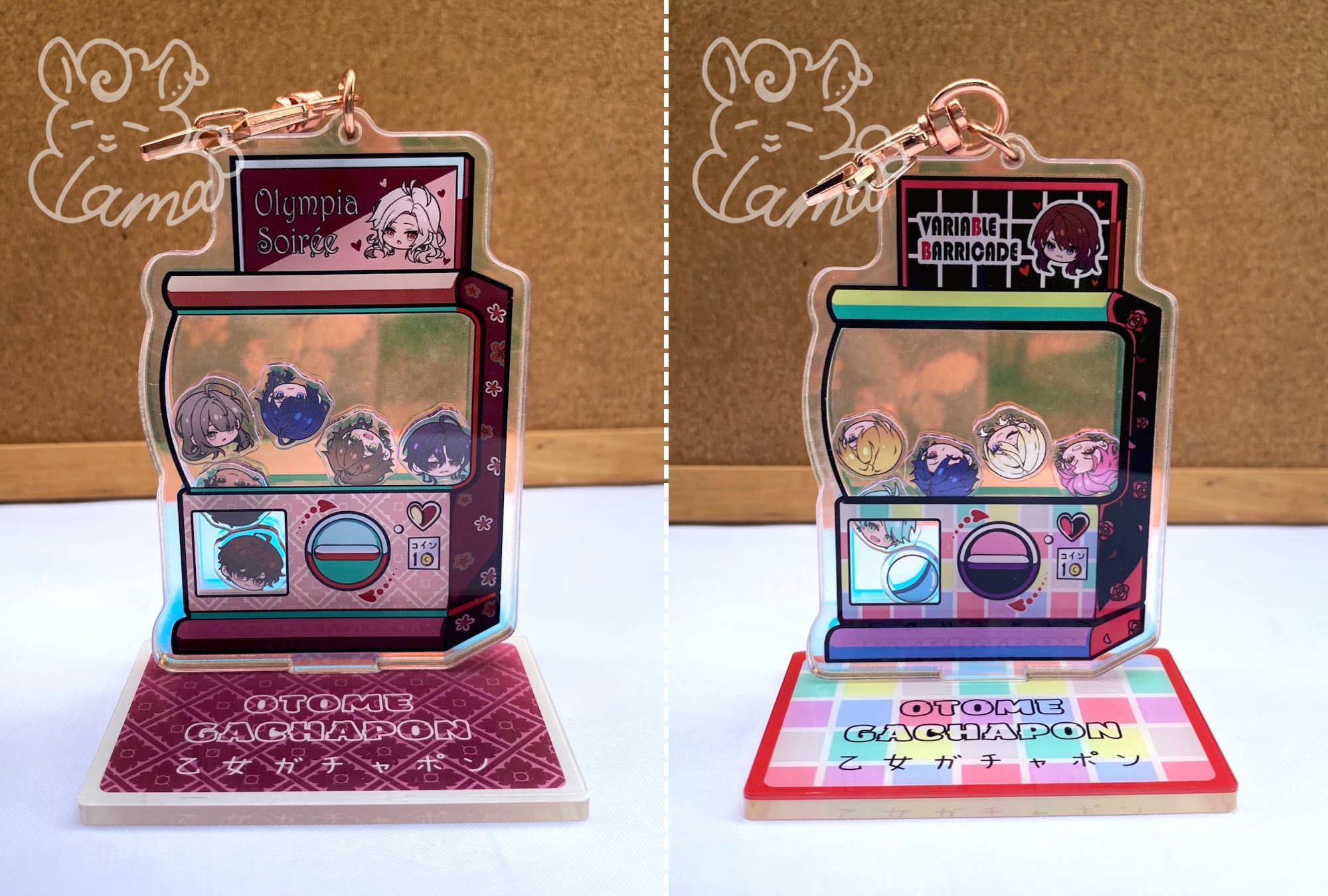 There’s a lot to love in LlamaFloof’s line of otome merch, but one in particular stands out for its quality and creativity. The otome gachapon shaker charms work as both acrylic standees and keychains, and they’re functional too! When you shake them, the little heads rattle around inside the gachapon, until one falls down as your “prize”.