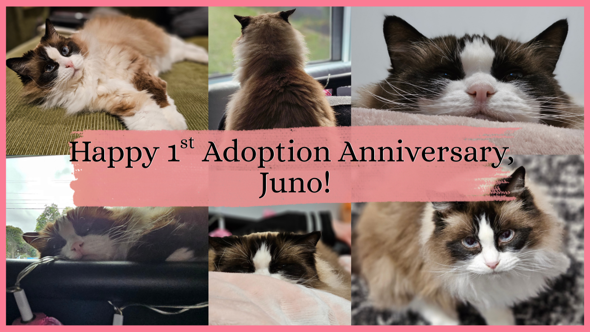 Happy 1st Adoption Anniversary, Juno! ♥ Here’s to many more years of cozy cuddles and cat caves ♥